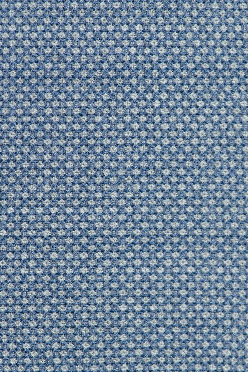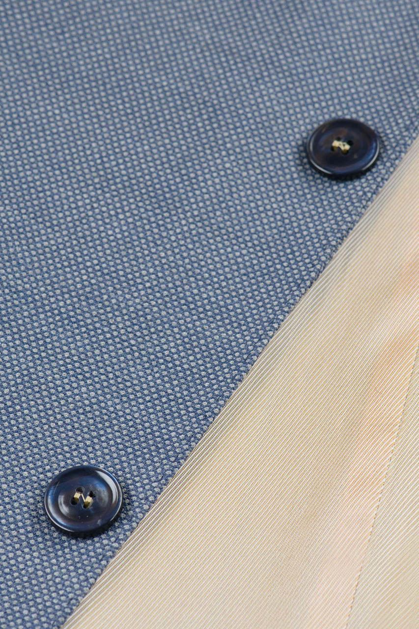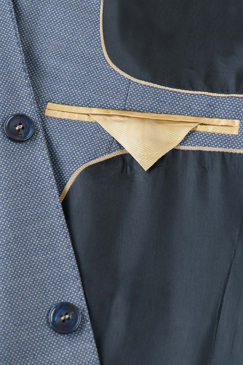 Niebieska marynarka męska z spiczastymi klapami, uszyta z tkaniny z widoczną strukturą. Klasyczny fason z ozdobnymi klapami w szpic, zapinany na jeden rząd guzików. Z przodu dwie kieszenie zakończone patką i zegarówka, z tyłu dwa rozcięcia. Guziki przyszyte kontrastową nicią w beżowym kolorze. Marynarka idealna do półformalnych zestawów z jasną koszulą i beżowymi chinosami.