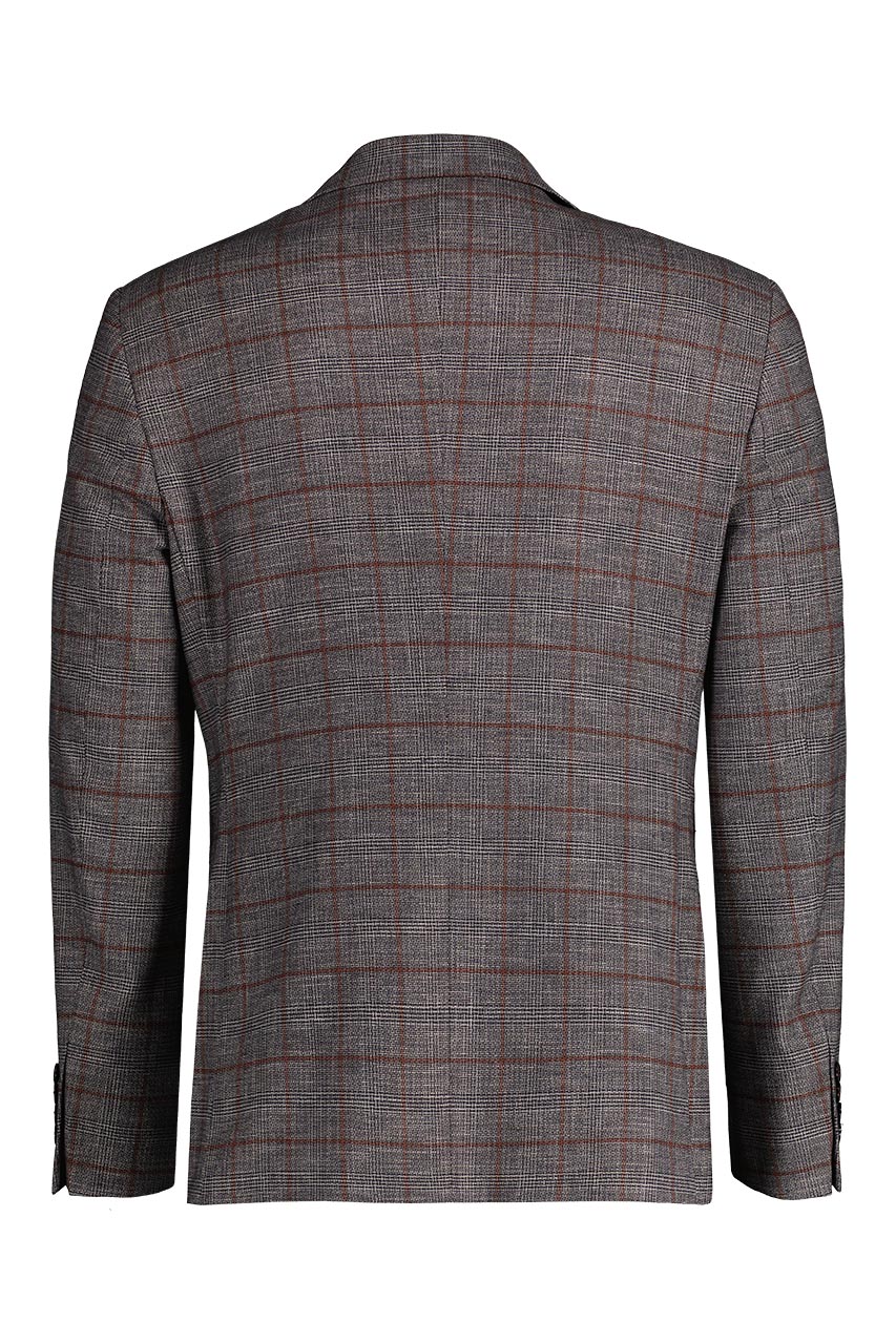 Marynarka w burgundową kratę. Model uszyty z przyjemnej w dotyku tkaniny z dodatkiem lnu. Marynarka zapinana na dwa guziki. Posiada dwie kieszenie z patką i brustaszę. W klapie ozdobny pin z logo marki.