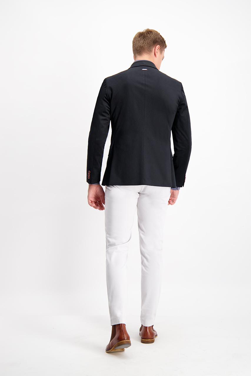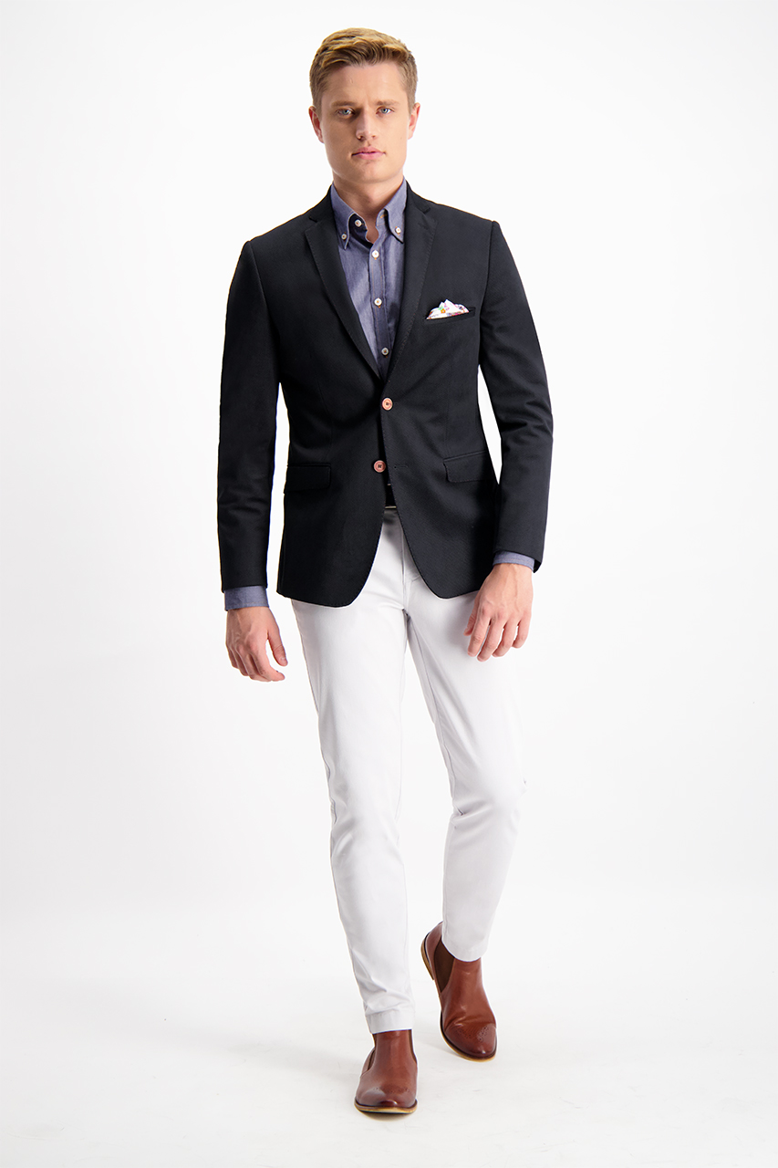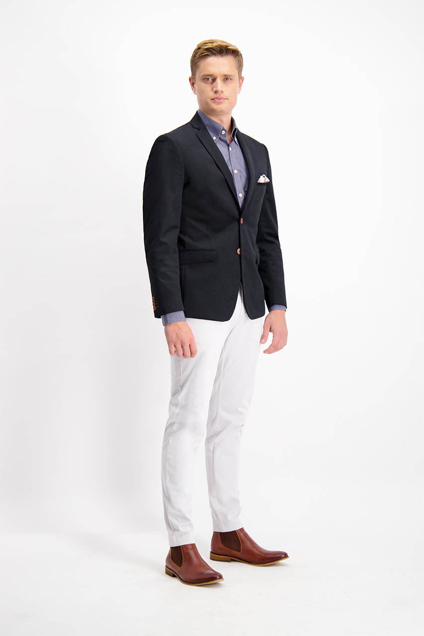 Czarna marynarka męska o kroju slim. Uszyta z przyjemnej w dotyku tkaniny flok w deseń rombów. Fason z szerszymi klapami, zapinany na jeden rząd guzików w pomarańczowej kolorystyce. Posiada szew AMF utrzymany w kontrastowym kolorze, nawiązujący do tradycyjnego krawiectwa. Z przodu dwie kieszenie z asymetryczną patką i cięta piersiówka z ozdobnym workiem kieszeniowym, z tyłu dwa rozcięcia. Idealna do eleganckich i półformalnych stylizacji. Świetnie prezentuje się w zestawie z jasną koszulą i pomarańczowymi spodniami chino.