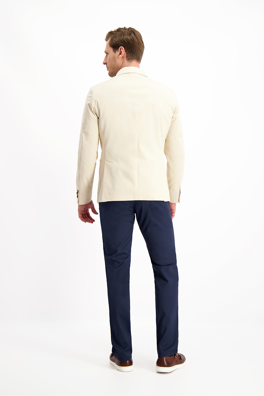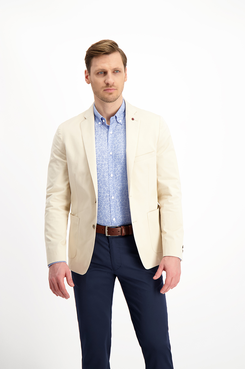 Sportowa marynarka męska wykonana z wysokiej jakości bawełny. Lekki, beżowy model o dopasowanym kroju. Marynarka bez podszewki, zapinana na dwa guziki w brązowym odcieniu. Posiada dwie kieszenie nakładane i jedną kieszeń piersiową obszyte szwem AMF nawiązującym do tradycyjnego krawiectwa. To fantastyczna propozycja, która łączy w sobie klasykę i nowoczesny design. Idealna pozycja do wiosennych zestawień z brązowymi lub niebieskimi chinosami.