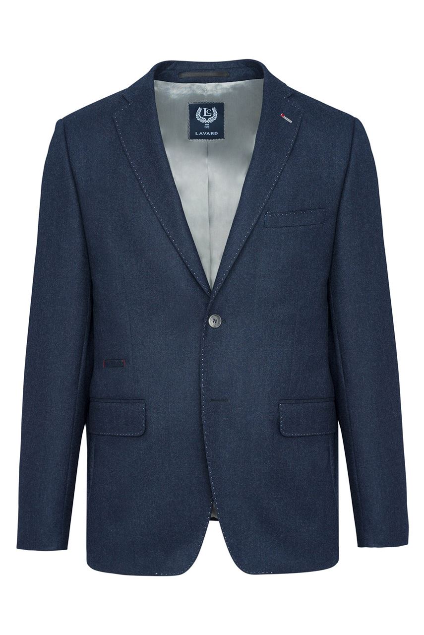 Casualowa marynarka w granatowym kolorze, uszyta z najwyższej jakości wełny 120's, pochodzącej z renomowanej tkalni Vitale Barberis Canonico. Model jednorzędowy o regularnym kroju, zapinany na dwa guziki. Z tyłu dwa rozcięcia. Niezobowiązującego charakteru nadają ozdobne przeszycia AMF w kontrastowym, szarym kolorze. Z przodu proste kieszenie zakończone patkami oraz zegarkówka, obszyta bordową nicią. Pod kołnierzem szary filc. Marynarka świetnie sprawdzi się zestawie z bordowymi lub szarymi chinosami.