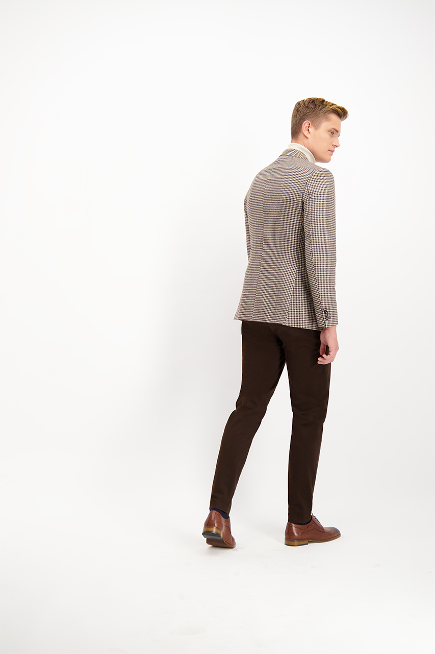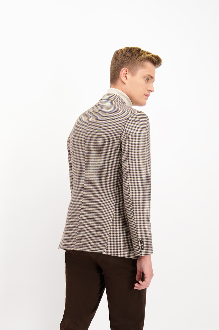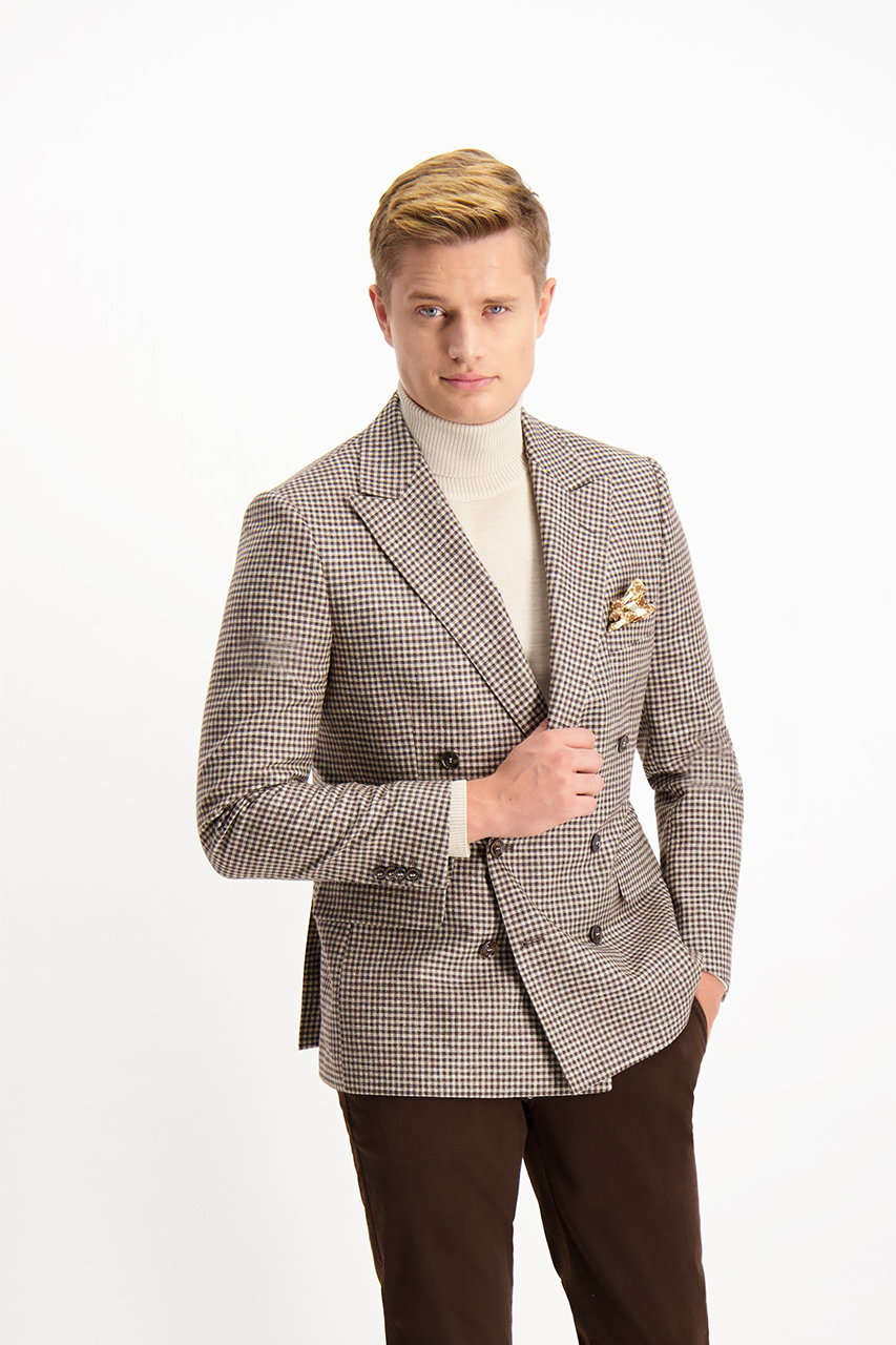 Marynarka dwurzędowa męska w kratę, utrzymana w ponadczasowych kolorach brązu i beżu. Wykonana w 60% z najwyższej jakości wełny, domieszka bawełny i włókna syntetycznego wpływa korzystnie na komfort użytkowania oraz sprawia, że marynarka jest niezwykle przyjemna w dotyku. Zapinana na dwa rzędy guzików, posiada modne szersze klapy oraz dwie kieszenie zakończone patką i jedną piersiową. Doskonała jesienna propozycja dla stylowych mężczyzn.