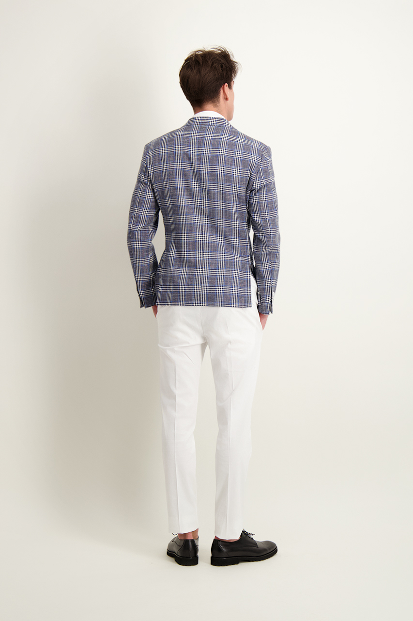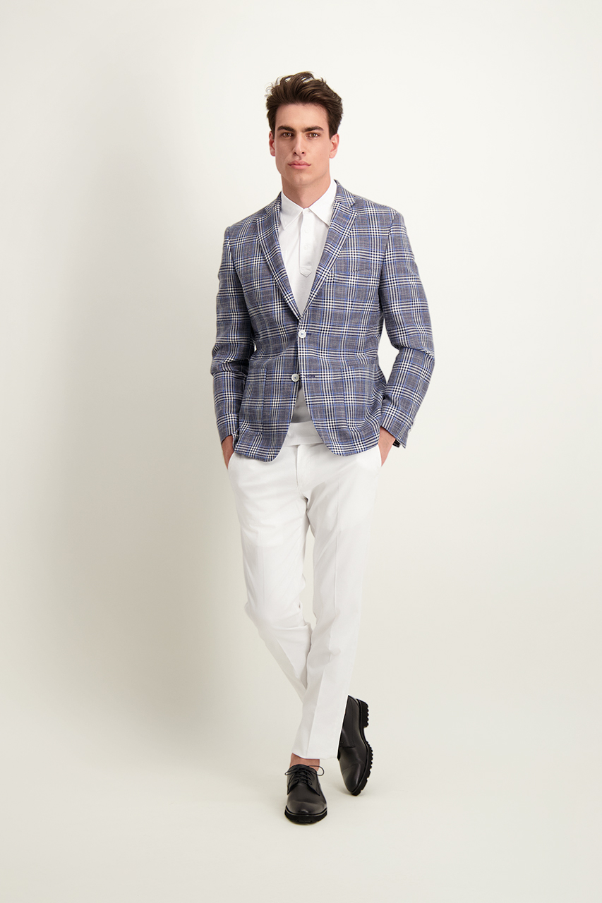 Model uszyty z wełnianej tkaniny z dodatkiem bawełny i lnu. Marynarka o dopasowanym fasonie. Model ma 188 cm wzrostu i prezentuje rozmiar 48. Wyprodukowano w Polsce.