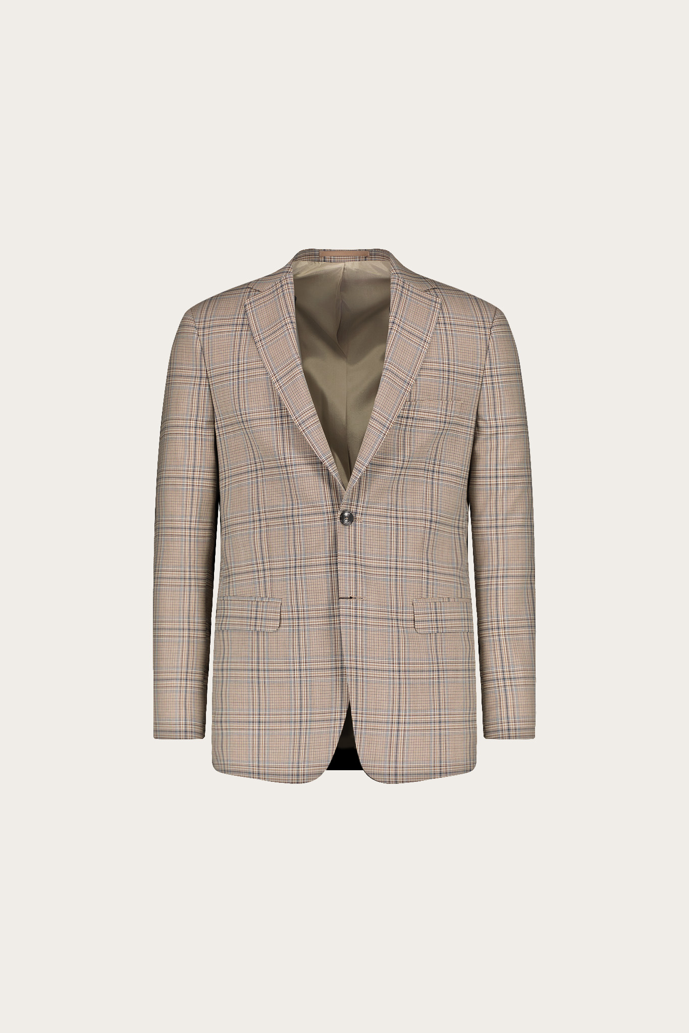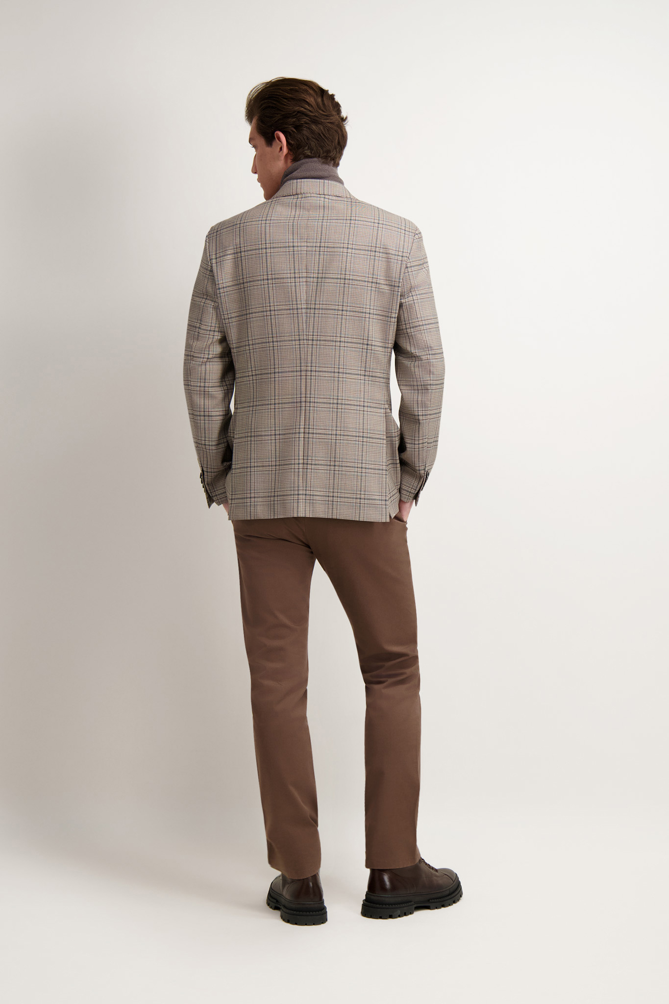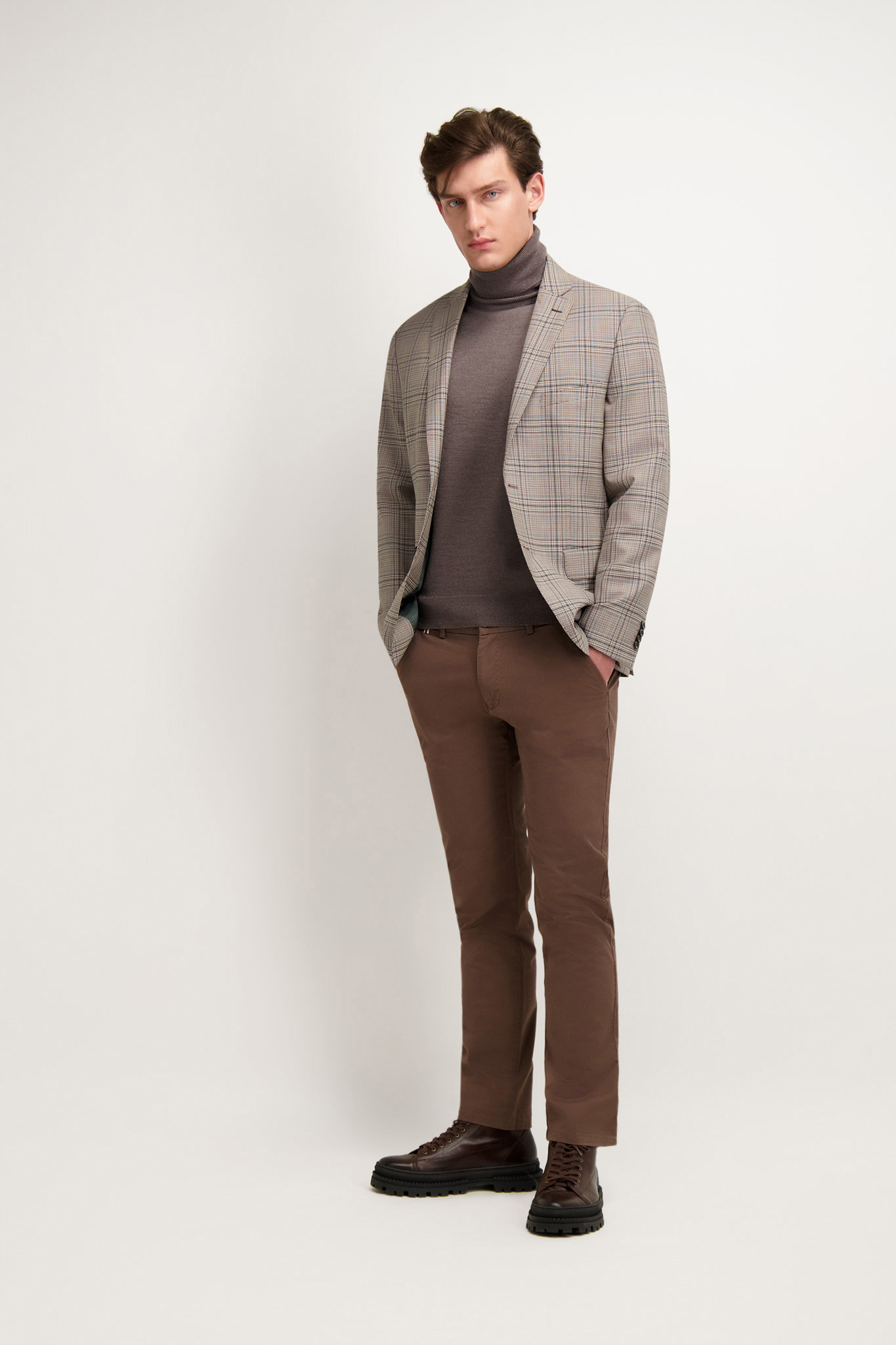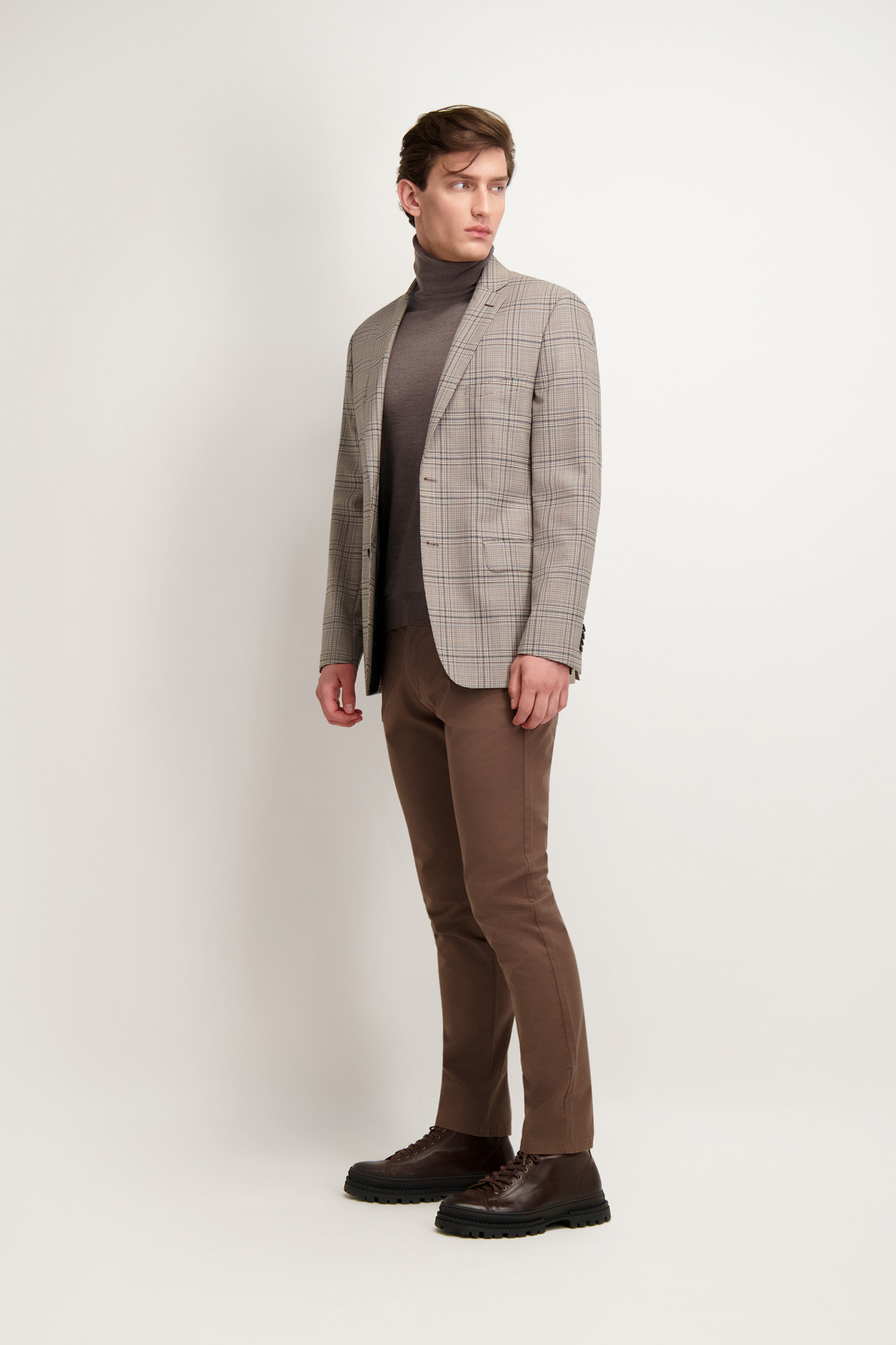 Wełniana mrynarka męska w brązowym odcieniu. Model w kratę o klasycznym fasonie. Wyprodukowano w Polsce.
