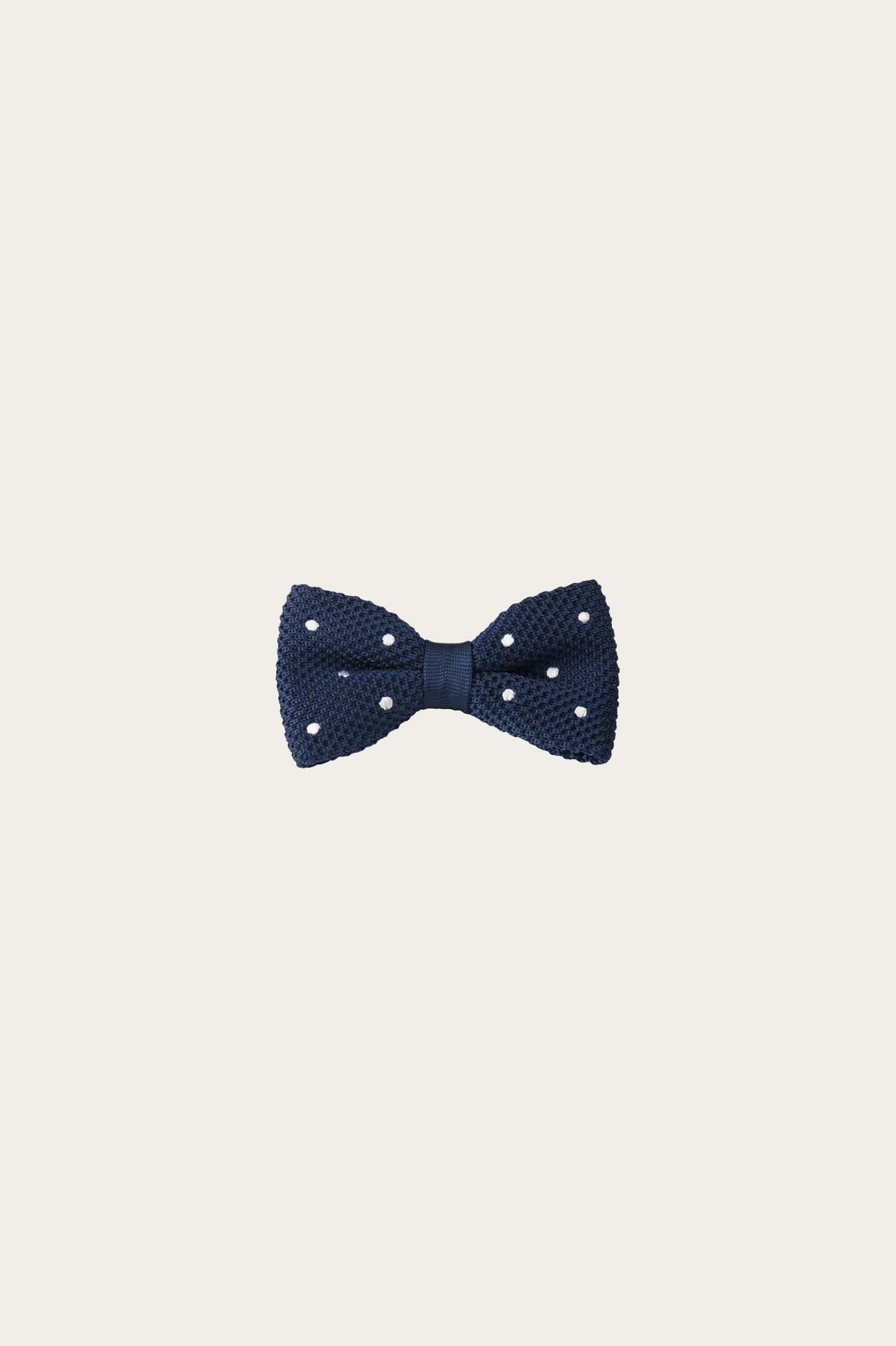 Dzianinowa mucha w kolorze granatowym, we wzór białych kropek. Posiada wygodną regulację, umożliwiającą łatwe dopasowanie do pożądanego rozmiaru. Świetny dodatek do nieformalnych stylizacji: casualowej marynarki oraz chinosów.