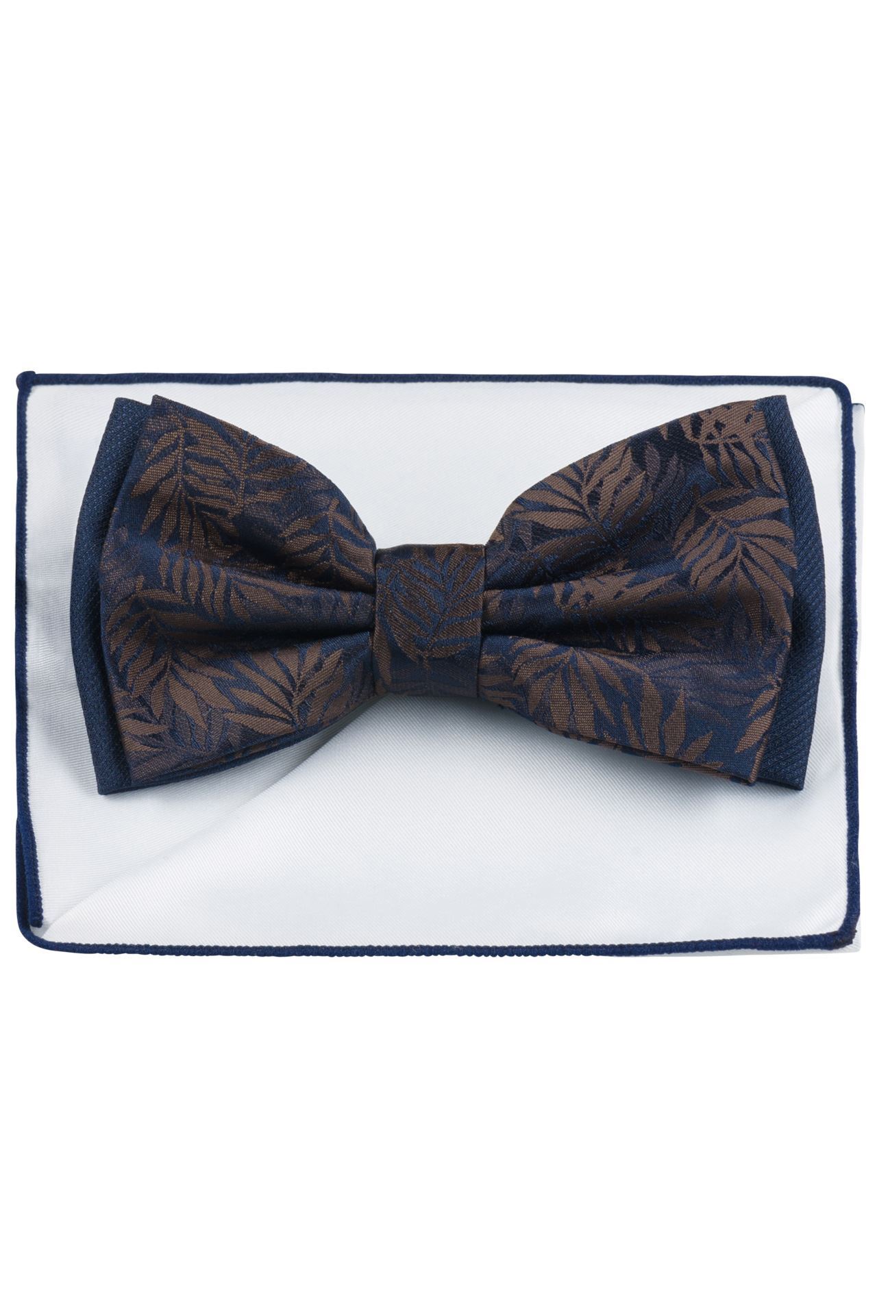 Granatowa mucha z delikatnym brązowym motywem roślinnym. Posiada wygodną regulację, umożliwiającą łatwe dopasowanie do pożądanego rozmiaru. W zestawie dołączona jest biała poszetka, ręcznie obszyta granatową lamówką. Idealna do styliacji zarówno formalnych jak i casualowych.