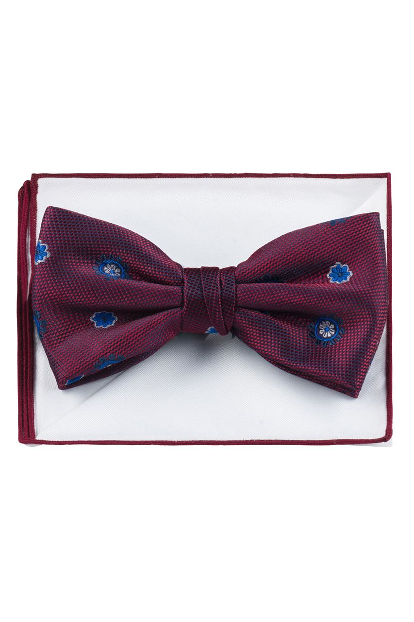 Bordowa mucha w delikatną strukturę, wykonana z tkaniny lekko opalizującej na niebiesko. Posiada delikatny wzór niebieskich kwiatów. W zestawie dołączona jest biała poszetka, ręcznie obszyta bordową lamówką. Model doskonały do formalnych stylizacji a zwłaszcza do niebieskiego i granatowego garnituru.