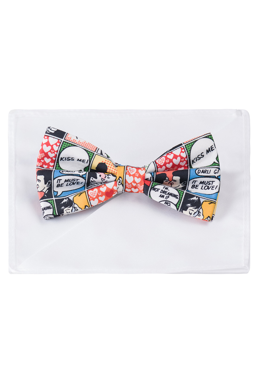 Mucha wielokolorowa z nadrukowanym elementem komiksu. Posiada wygodną regulację, umożliwiającą łatwe dopasowanie do pożądanego rozmiaru. W zestawie dołączona jest biała poszetka. Uniwersalny dodatek do stylizacji formalnych z garniturem a także casualowych z marynarką oraz chinosami.