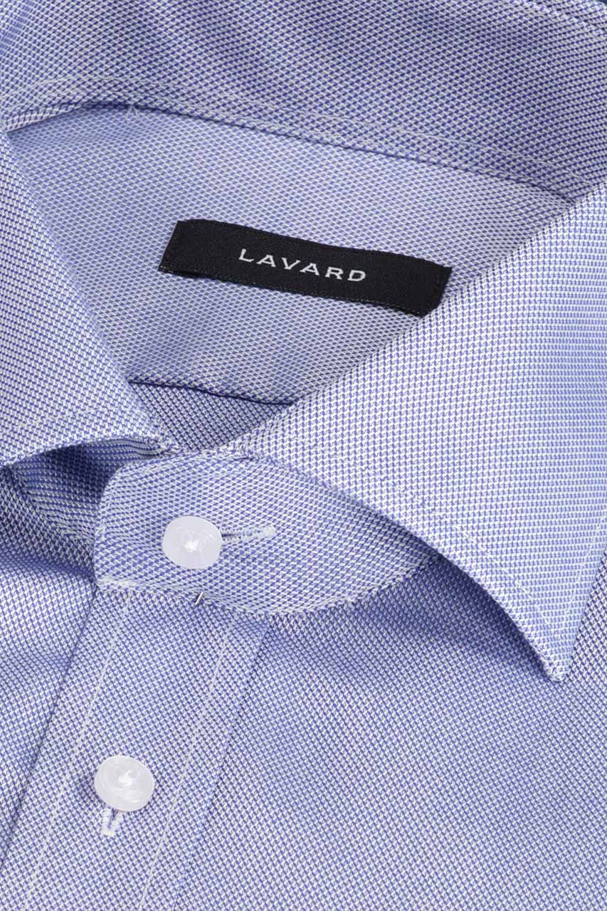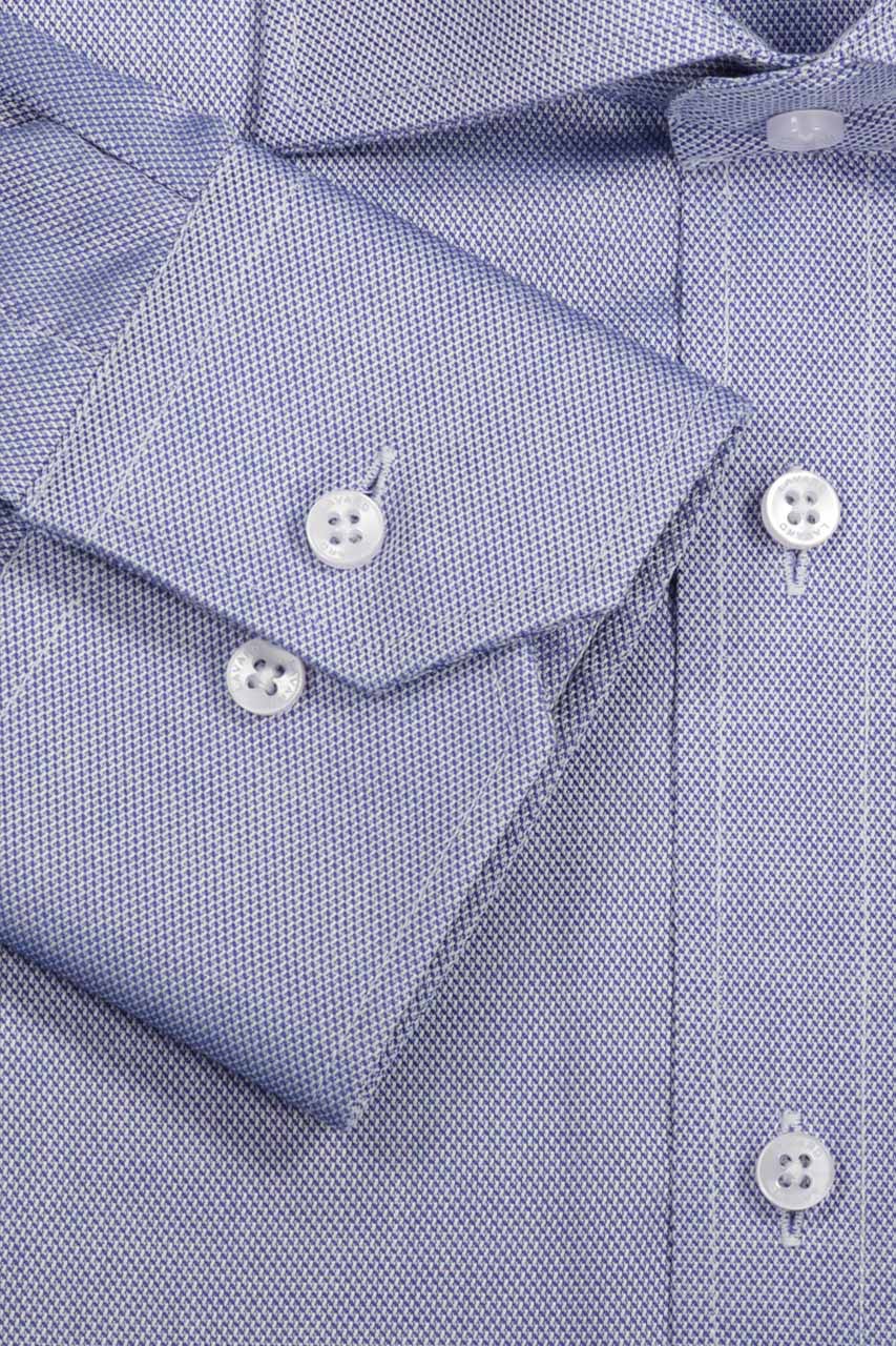 Niebieski model z długim rękawem, uszyty z bawełnianej tkaniny ze subtelną strukturą. Koszula o klasycznym, dopasowanym kroju. Zapinana na guziki w perłowym kolorze.