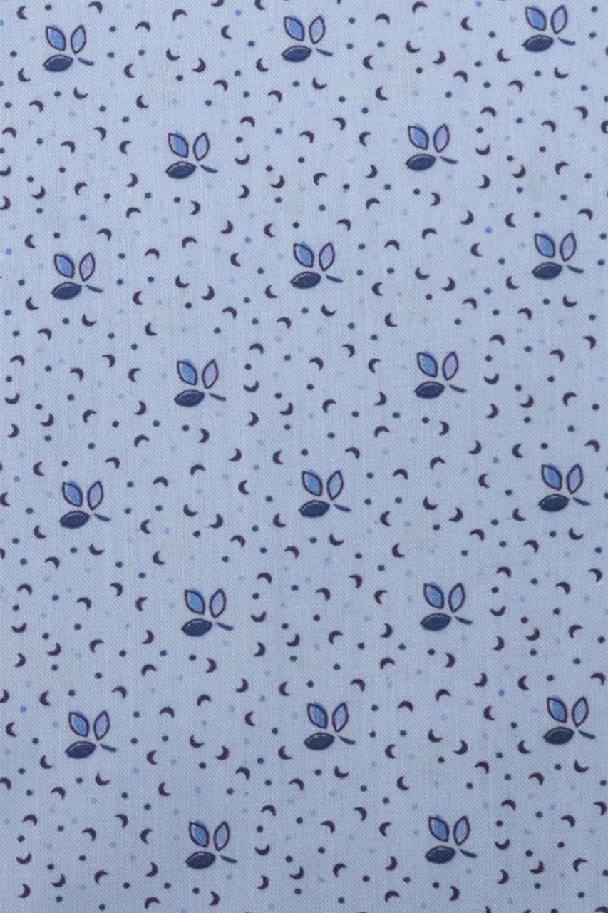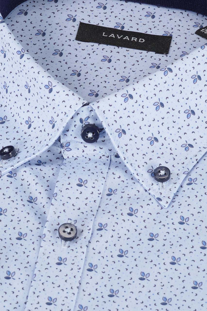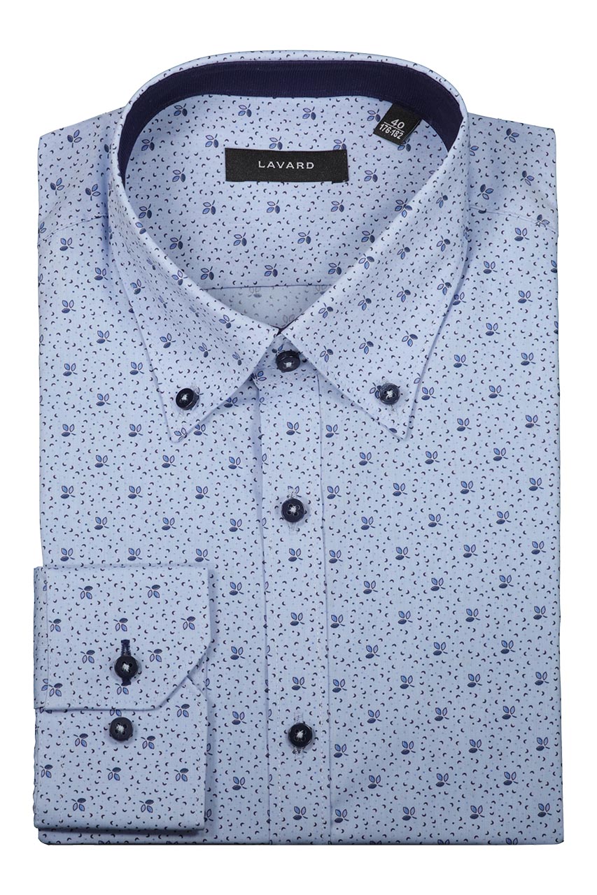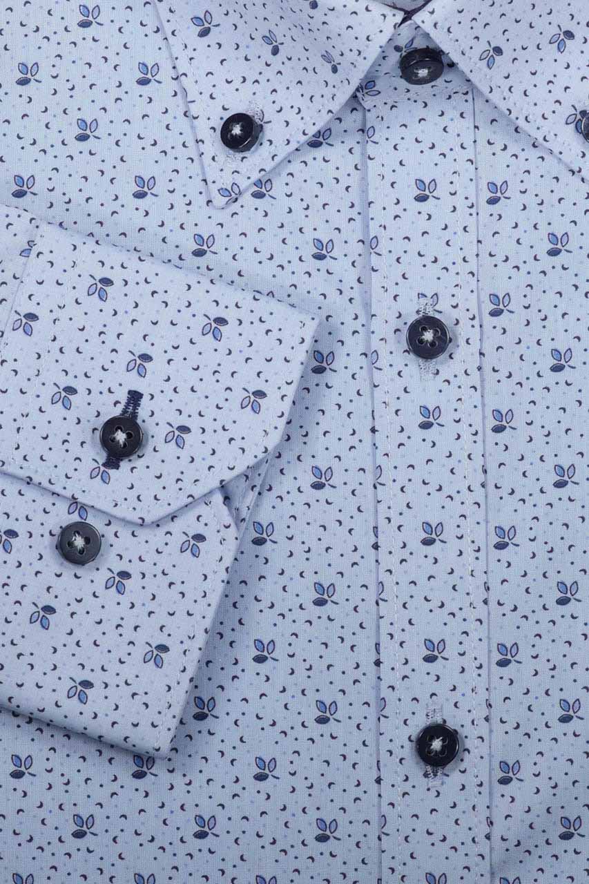 Niebieska koszula męska w mikro wzór. Model z kołnierzykiem button down i z długim rękawem. Uszyta z przyjemnej tkaniny bawełnianej, która sprawdzi się zarówno jesienią jak i wiosną. To model, który jest ciekawym pomysłem na urozmaicenie stylizacji z granatowym garniturem lub jeansami i marynarką.
