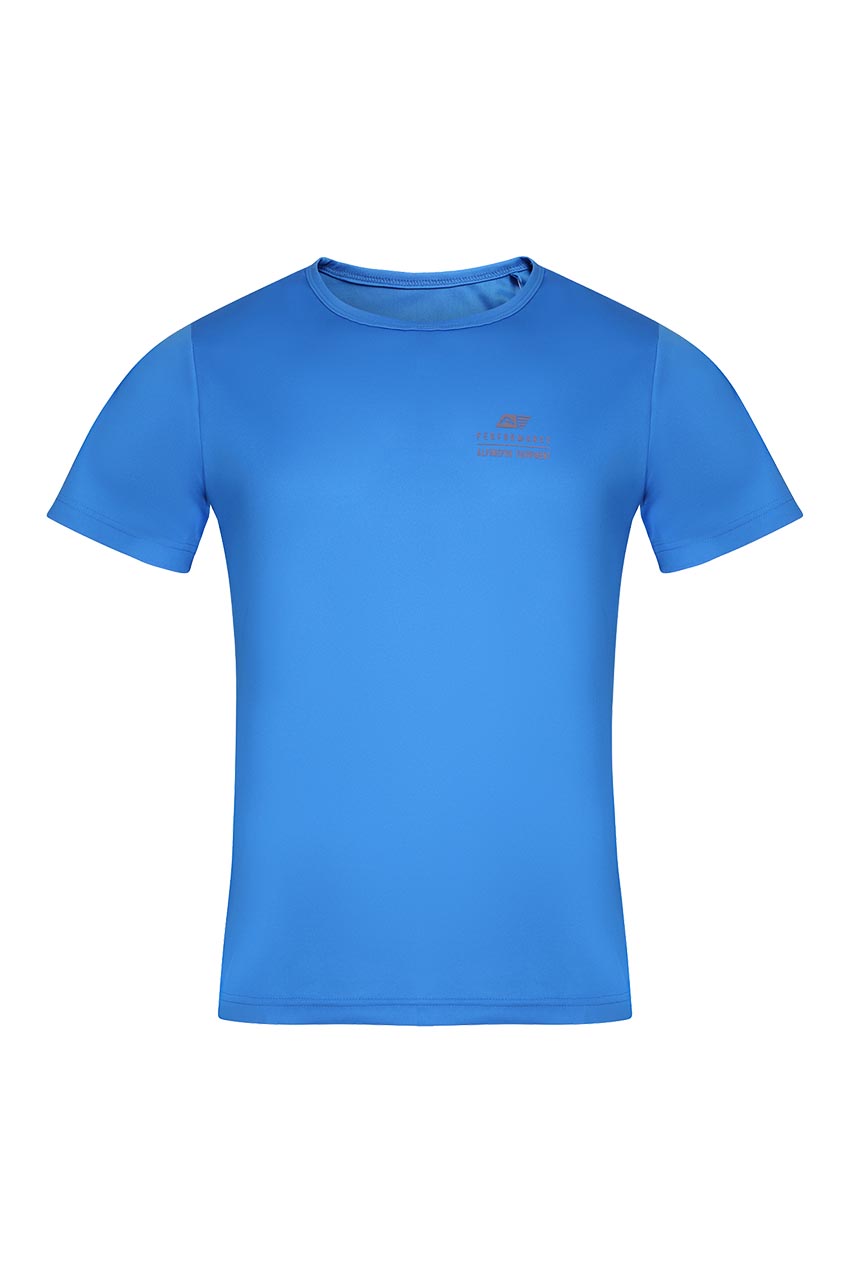 Niebieska koszulka treningowa męska z krótkim rękawem oraz okrągłym dekoltem. Została uszyta w prostym kroju, z oddychającej i szybkoschnącej tkaniny, która świetnie nadaje się do wszelkich aktywności fizycznych oraz treningu. Koszulka posiada elementy odblaskowe, które podnoszą widoczność po zmroku lub w trudnych warunkach atmosferycznych, a jej kolor pozwala wyróżnić się, nawet podczas uprawiania sportu.