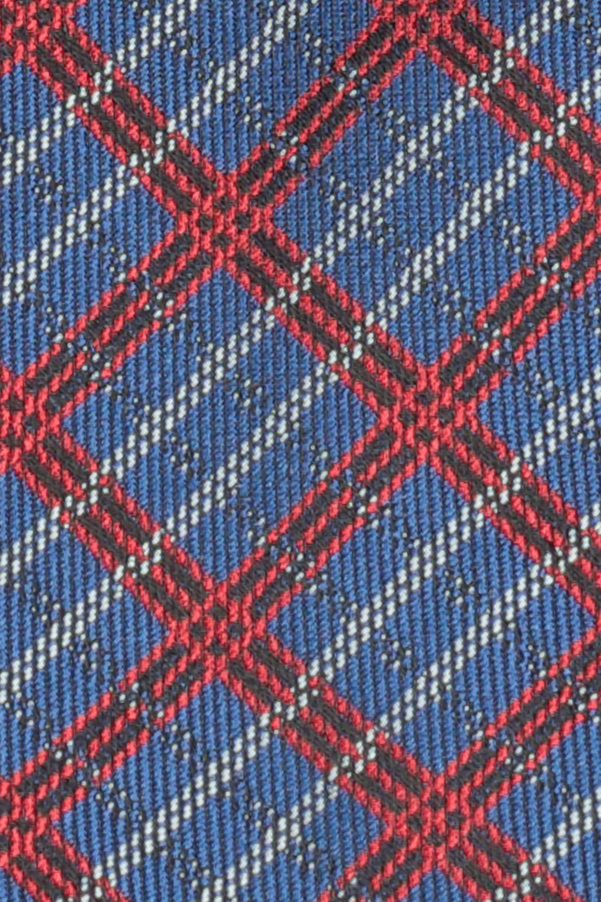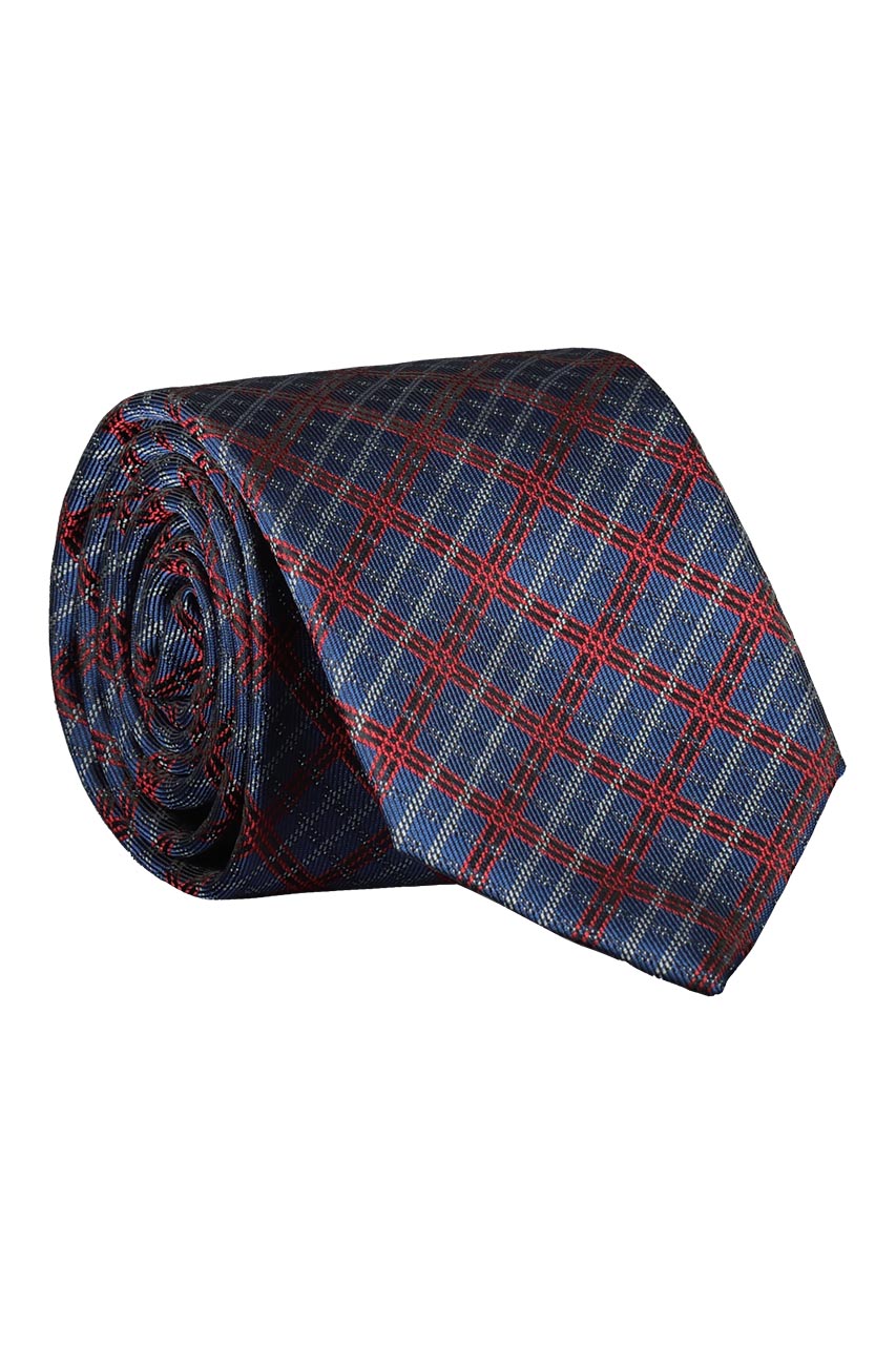 Niebieski krawat w czerwoną kratę. Wyrazisty model pasujący zarówno do casualowych jak i pół formalnych zestawień. Świetnie prezentuje się z garniturem jak i ze sportową marynarką.