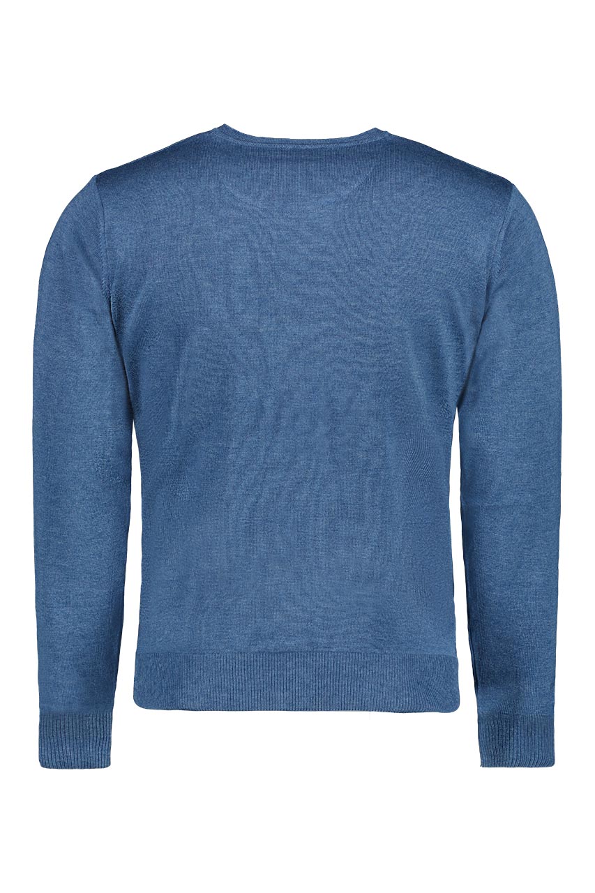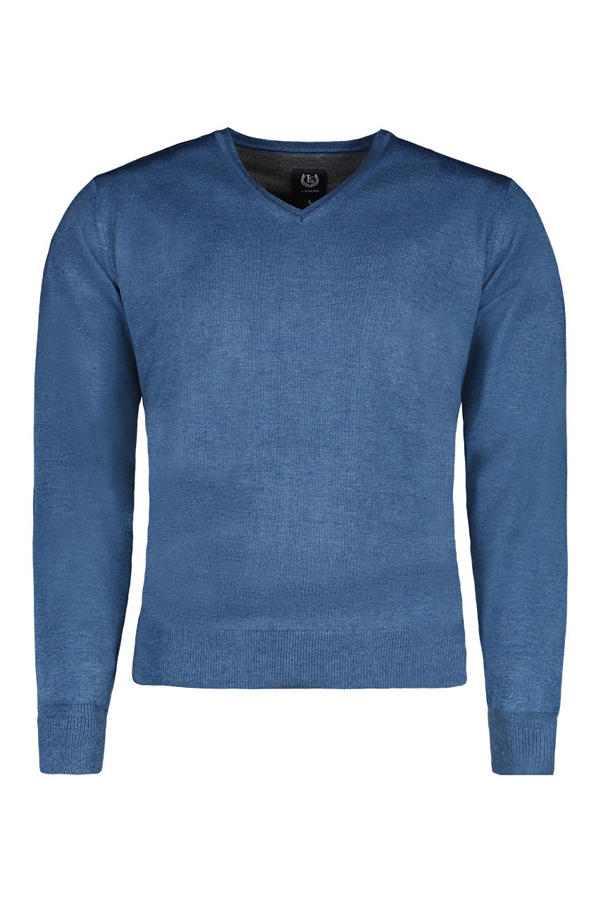 Sweter męski utrzymany w niebieskim odcieniu. Propozycja z dekoltem w serek tzw. V neck to bez wątpienia klasyk wśród swetrów męskich. Model o klasycznym, dopasowanym fasonie, świetnie prezentuje się na każdego typu sylwetce. To sweter idealny na co dzień jak i na uroczystości rodzinne. Wykonany jest z delikatnej i bardzo przyjemnej w dotyku dzianiny, sprawdzi się zarówno jesienią jak i wiosną. To propozycja, która doskonale wygląda noszona solo lub w bardziej eleganckim wydaniu z koszulą. Taki model powinien zagościć w garderobie każdego mężczyzny.