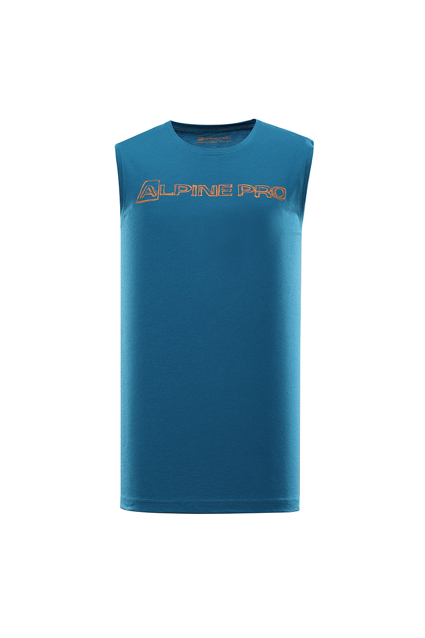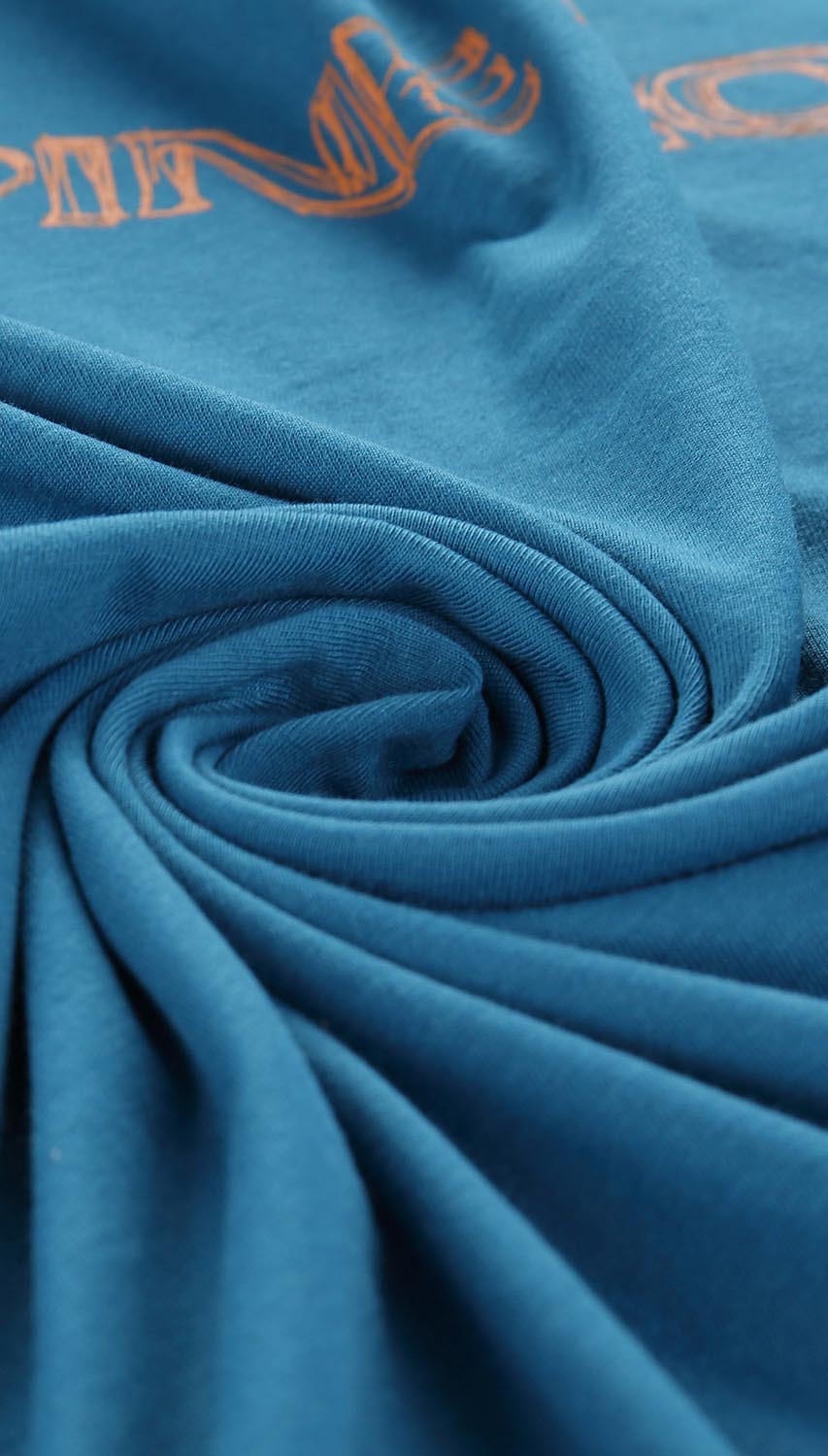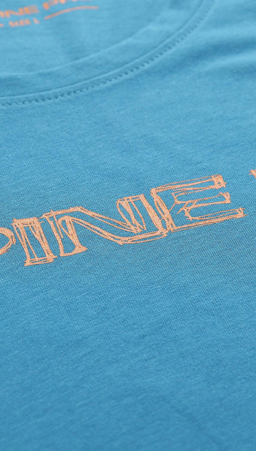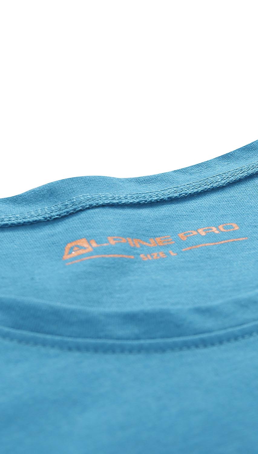 Klasyczny, niebieski t-shirt męski z krótkim rękawem. Został uszyty z miękkiej oraz przyjaznej dla skóry bawełny. Posiada okrągły kołnierzyk oraz ozdobny nadruk z przodu. Koszulka ma tradycyjny fason, dlatego świetnie sprawdzi się nie tylko na co dzień, ale także podczas aktywności fizycznej. To dobra propozycja do noszenia z chinosami, jeansami, a także spodniami trekkingowymi.