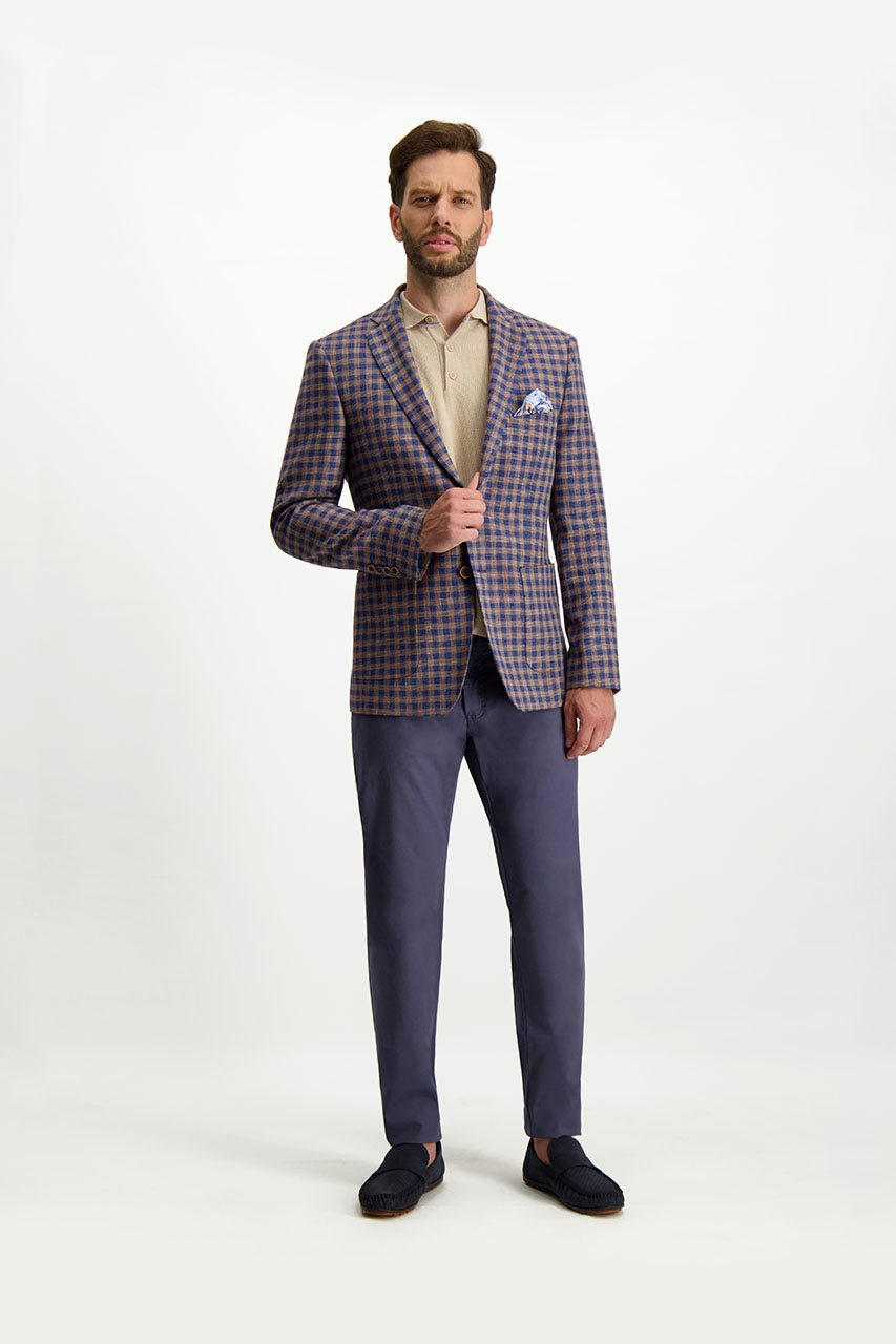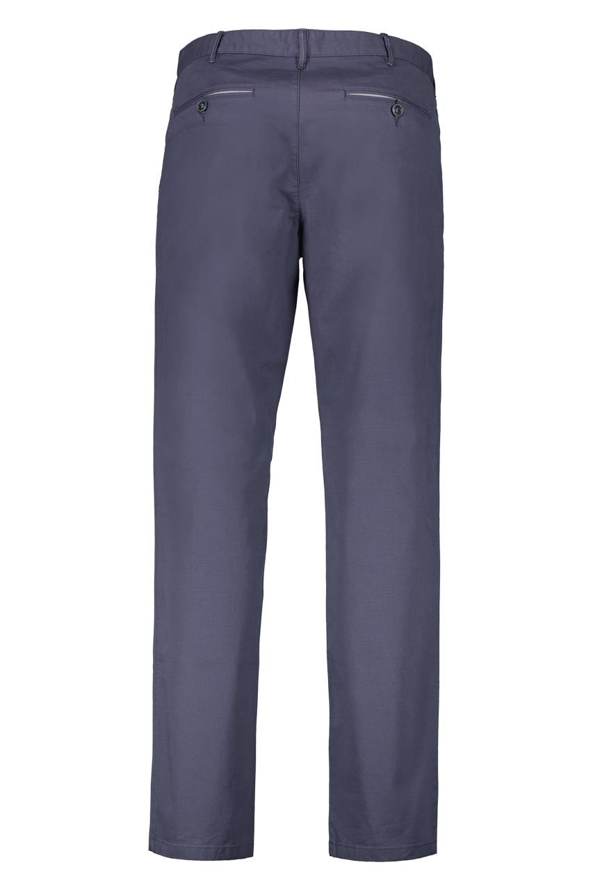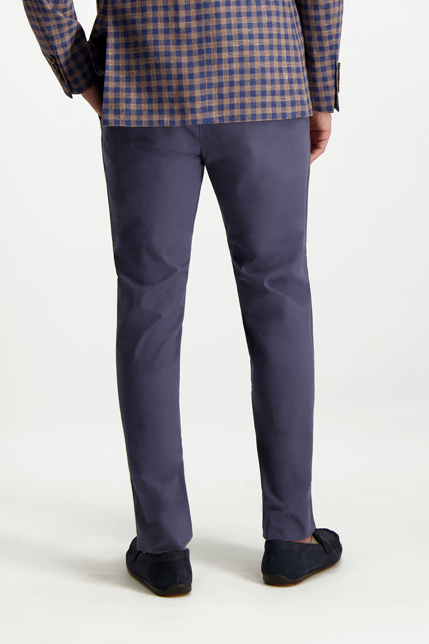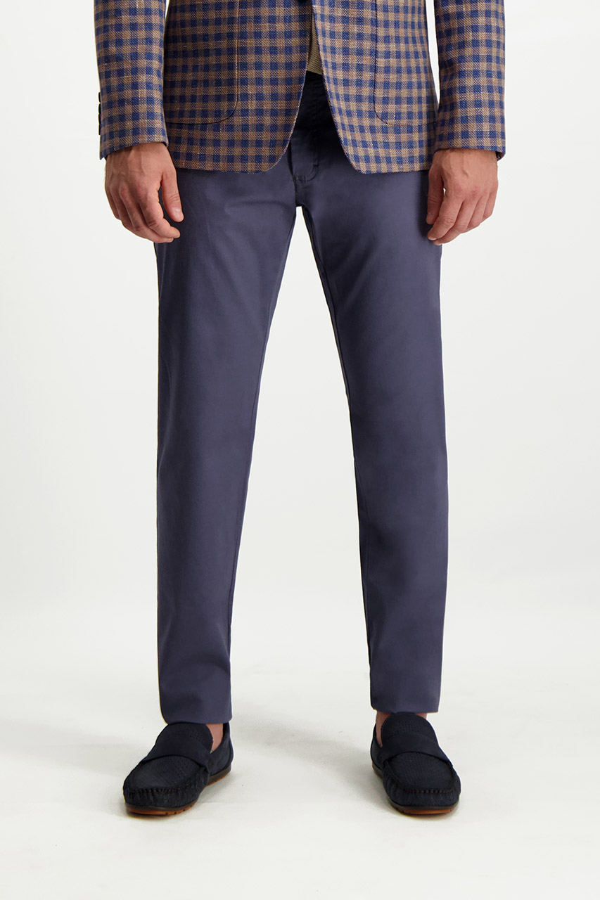 Ciemnoniebieskie spodnie męskie typu chinos o kroju slim fit. Zostały uszyte z jednolitej tkaniny bawełnianej z dodatkiem elastanu, który korzystnie wpływa na dopasowanie spodni do sylwetki. Spodnie posiadają wygodne, cięte kieszenie oraz szlufki z subtelnym przeszyciem. Sprawdzą się do pracy jako część kompletu z kraciastą marynarką oraz błękitną koszulą. Co więcej, są także świetnym wyborem na co dzień. Wystarczy je zestawić z koszulką typu polo lub klasycznym, białym t-shirtem. Do tego komfortowe sneakersy lub mokasyny i modny look gotowy.