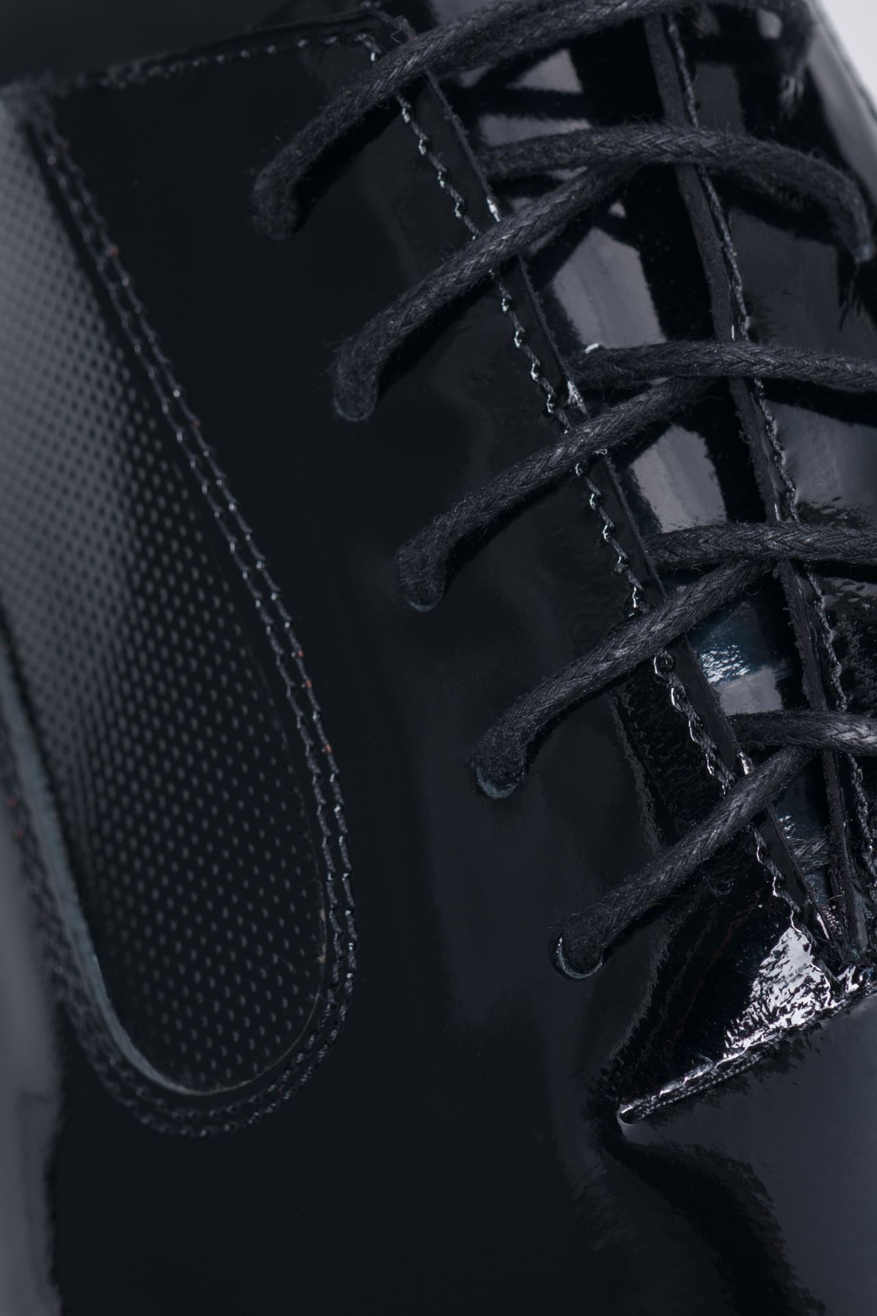 Pochodzące z kolekcji Lavard Ceremony, klasyczne lakierki w czarnym kolorze to model stworzony na wyjątkowe okazje. Elegancki fason, wykonany z gładkiej i błyszczącej skóry podkreśli rangę eleganckich stylizacji. Dodatkowe zdobienia w postaci perforowanych wstawek po bokach. Sznurówki w kolorze czarnym, gładki język, klasyczny obcas.