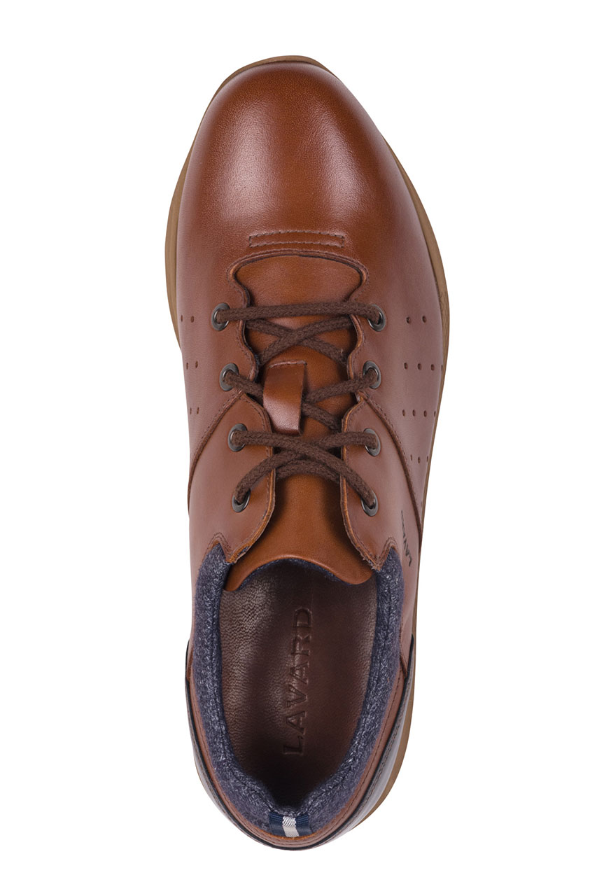 Modne sportowe buty męskie sneakersy w brązowym kolorze z granatowymi, stonowanymi wstawkami. Skórzany model w odcieniu ciepłego brązu z ozdobnym perforowaniem po bokach. Zapiętek udekorowany miłym w dotyku materiałem w jodełkę oraz wzmocniony granatową, wyróżniającą się skórą. Po bokach widoczne logo LAVARD. Nosek gładki, podeszwa dwukolorowa – połączenie jaśniejszego brązu i granatu. Model idealny do casualowych i sportowych stylizacji ze spodniami chino, jeansami oraz spodenkami.