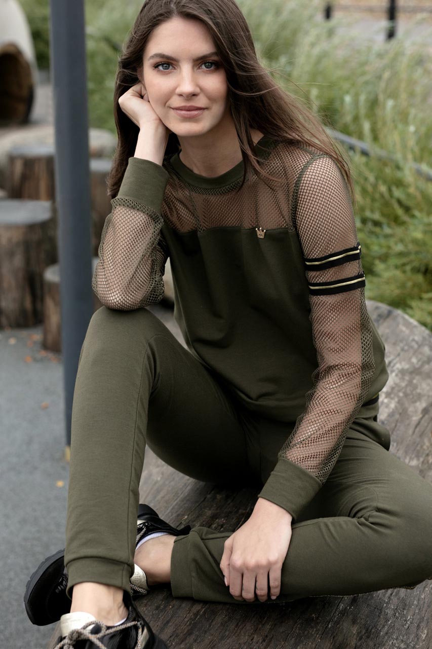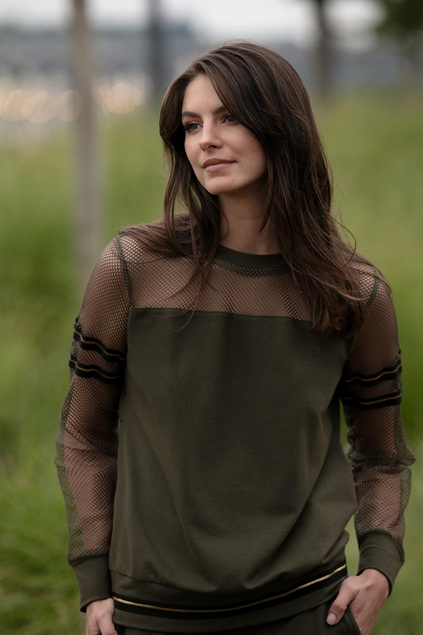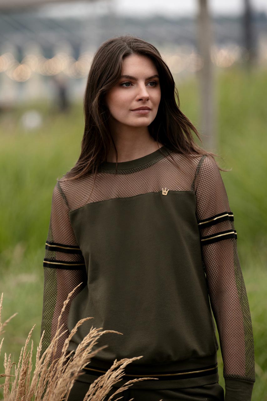 Oliwkowa bluzka damska nawiązująca do militarnego stylu to model idealny do miejskich i stylowych stylizacji. Na uwagę zasługuje dekolt oraz rękawy wykonane z siateczkowej tkaniny oraz ozdobne poziome lampasy ze złotym akcentem. Ten niebanalny model przypadnie do gustu kobietom szukającym niecodziennych rozwiązań. Świetnie prezentuje się zarówno w zestawie z płaszczem oversize i cięższymi butami jak i ze spodniami dresowymi i sneakersami.