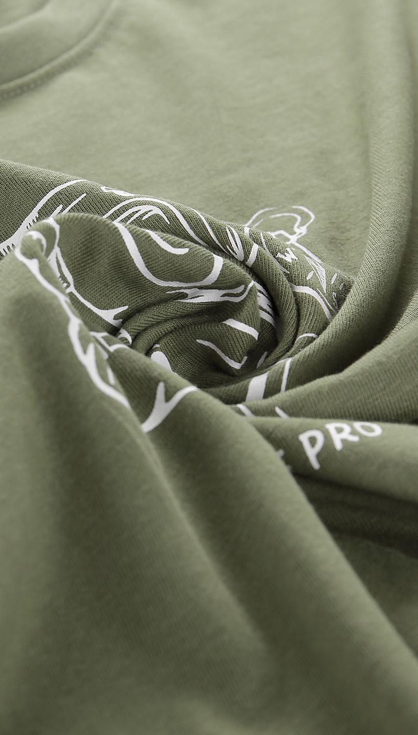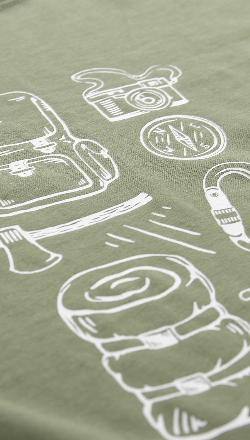 Oliwkowy t-shirt z nadrukiem uszyty w 100% z wysokiej jakości bawełny uzyskiwanej w procesie technologicznym sprzyjającym naturze. Naturalne włókna zapewniają wysoki komfort użytkowania i wygodę. Co więcej, tkanina bawełniana jest przyjazna dla osób uczulonych i cierpiących na alergie. Koszulka o regularnym kroju, doskonale układa się na sylwetce. To model, który fantastycznie odnajdzie się podczas wycieczek, spacerów czy spotkań z przyjaciółmi.