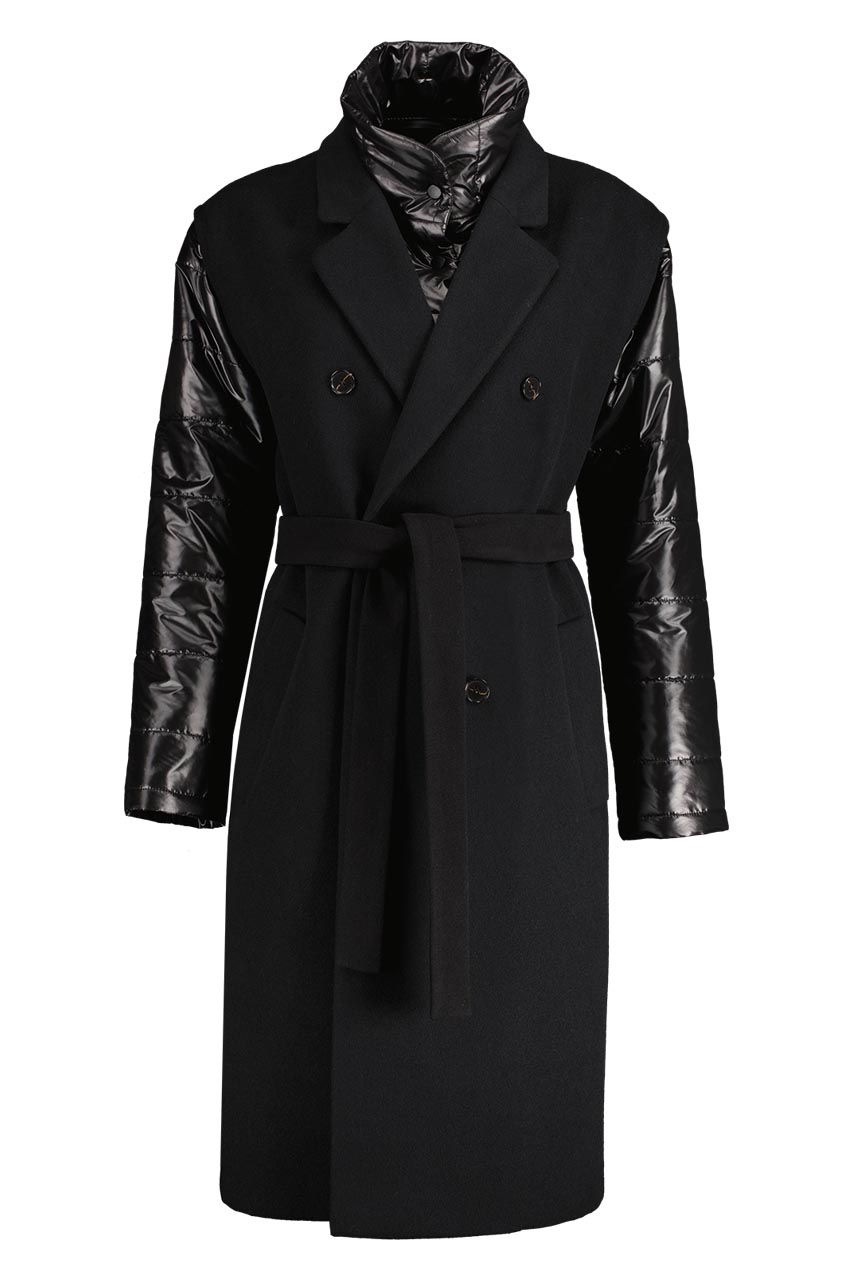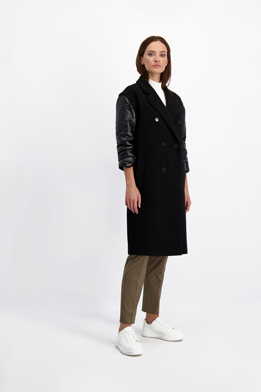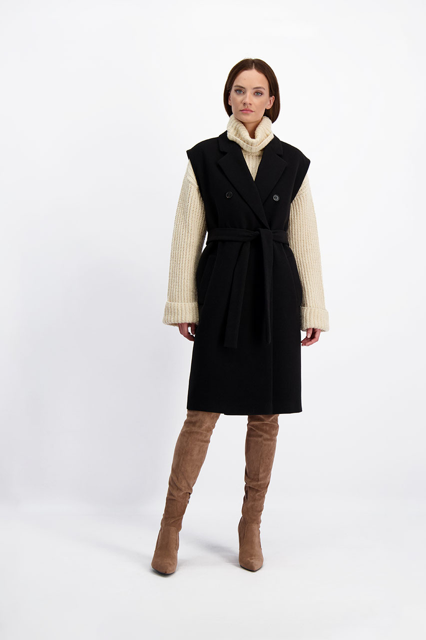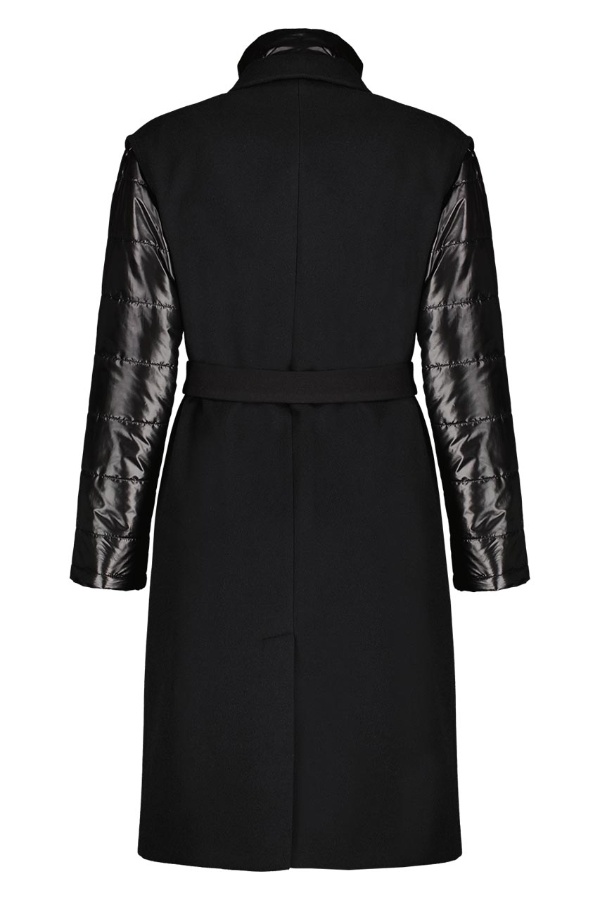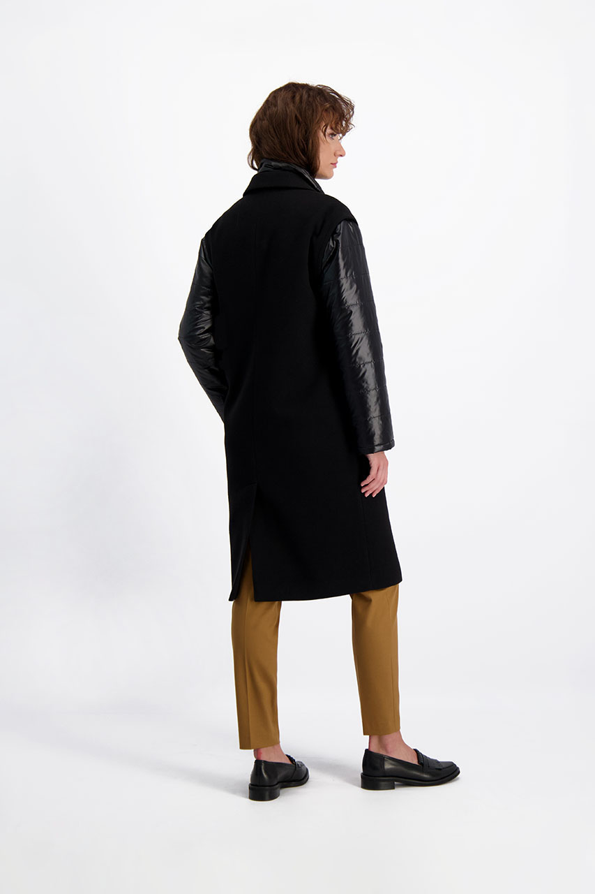 Funkcjonalny model o nowoczesnym kroju oversize. Może pełnić rolę płaszcza, jak i kamizelki. Płaszcz posiada ortalionowe, pikowane rękawy oraz kołnierz. Oba elementy można odpiąć. Model dwurzędowy, posiada dwie kieszenie po bokach. Do płaszcza dołączono pasek. Modelka ma 177 cm wzrostu. Prezentuje rozmiar 36.
