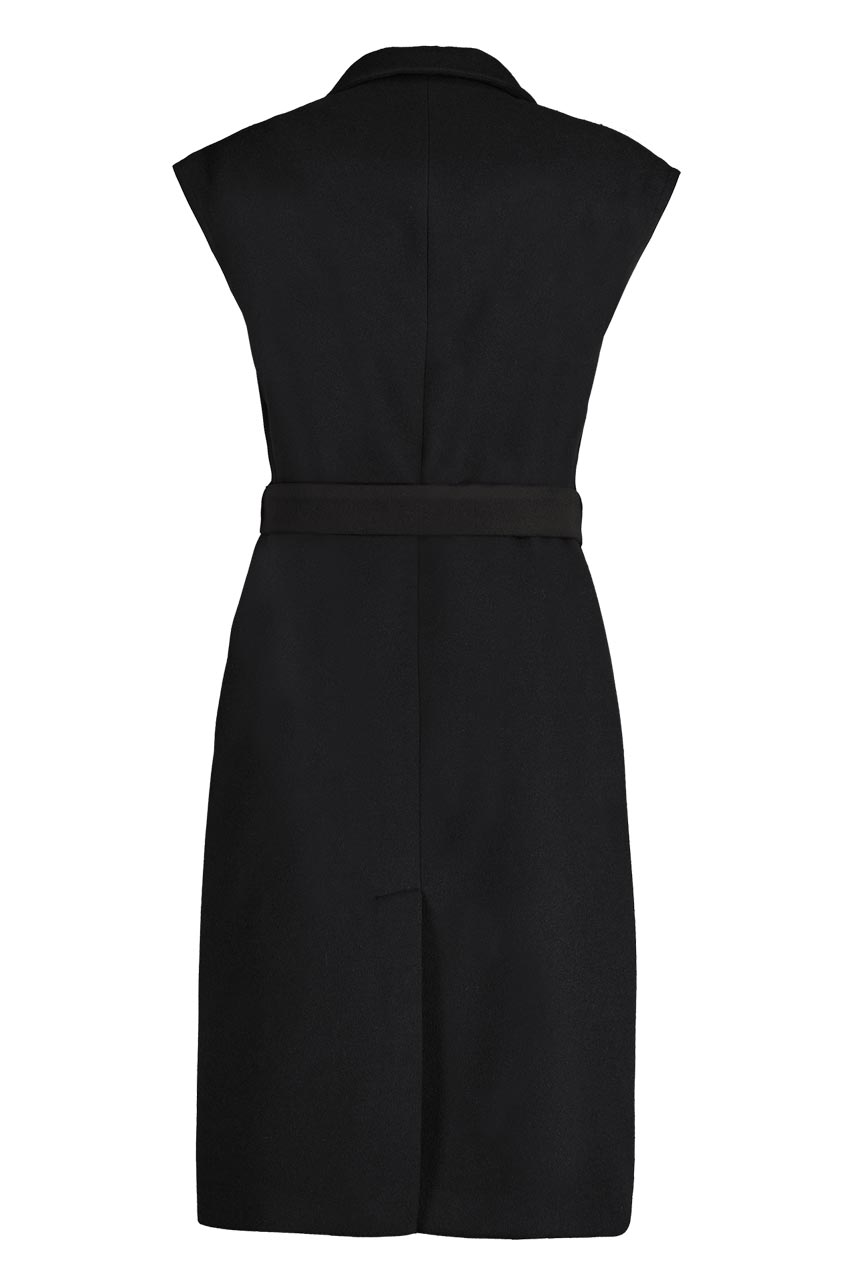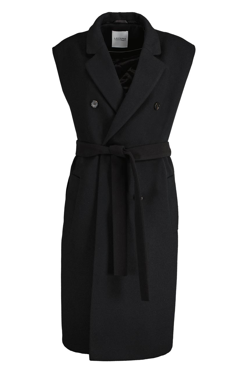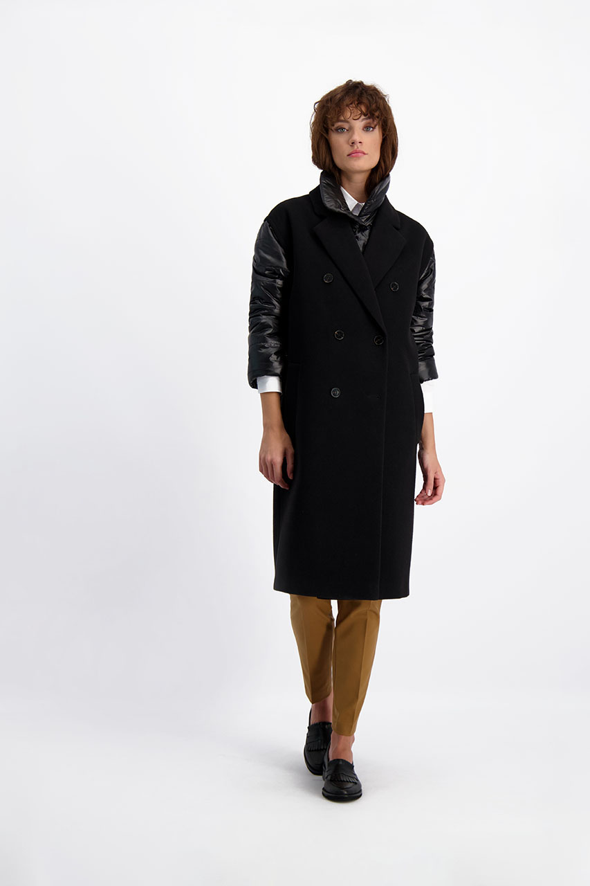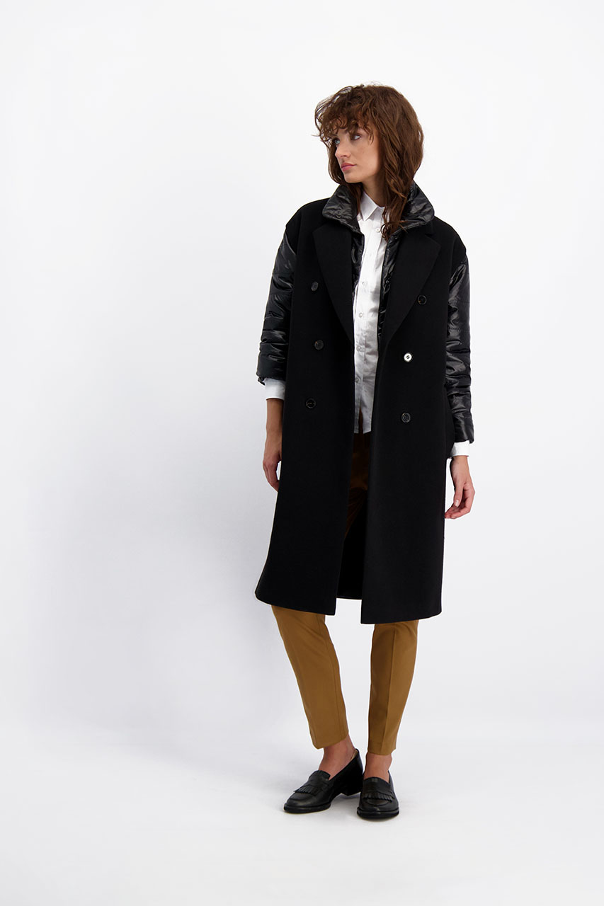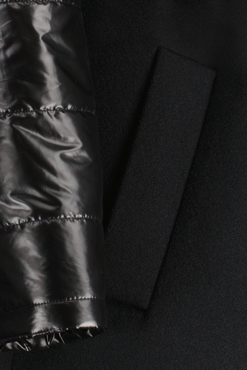 Funkcjonalny model o nowoczesnym kroju oversize. Może pełnić rolę płaszcza, jak i kamizelki. Płaszcz posiada ortalionowe, pikowane rękawy oraz kołnierz. Oba elementy można odpiąć. Model dwurzędowy, posiada dwie kieszenie po bokach. Do płaszcza dołączono pasek. Modelka ma 177 cm wzrostu. Prezentuje rozmiar 36.