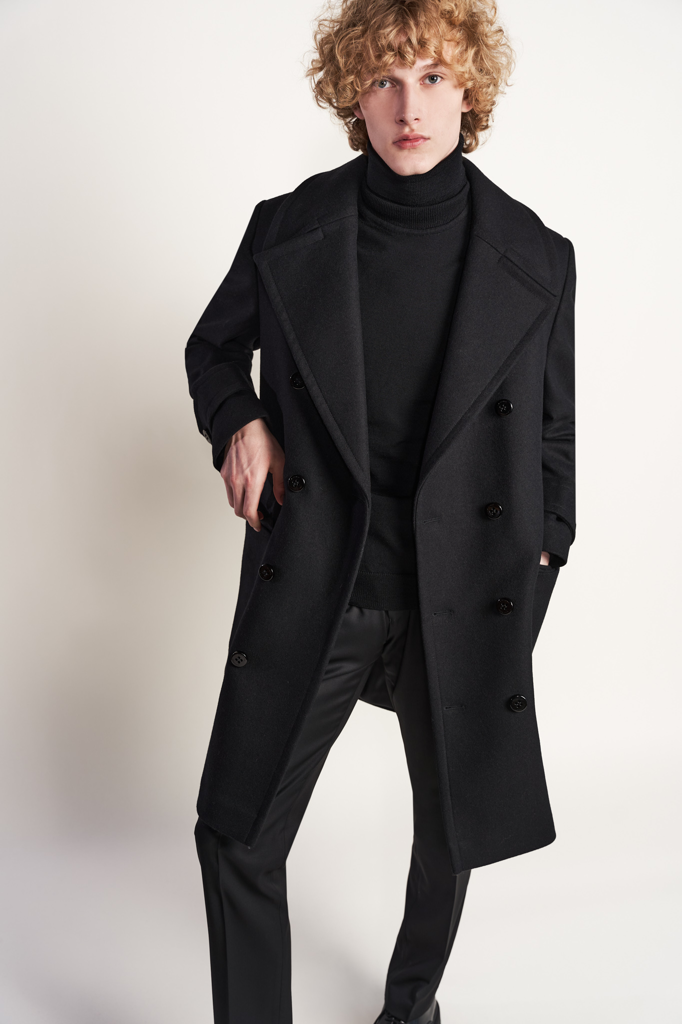 Dwurzędowy czarny płaszcz z wełną. Tkanina pochodzi od renomowanego, włoskiego producenta Rafanelli.