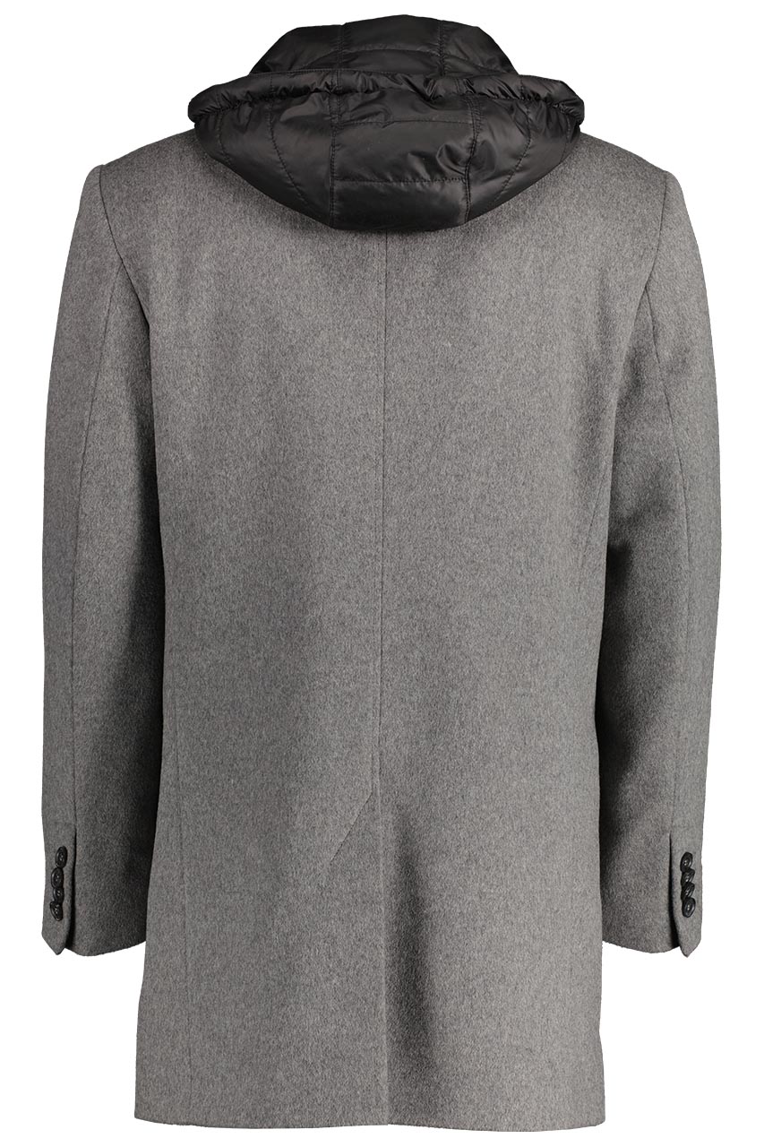 Wełniany płaszcz o kroju modern, uszyty z włoskiej tkaniny Comistra. Posiada odpinaną listwę ocieplającą z kapturem. Model ma 186 cm wzrostu. Prezentuje rozmiar 50.