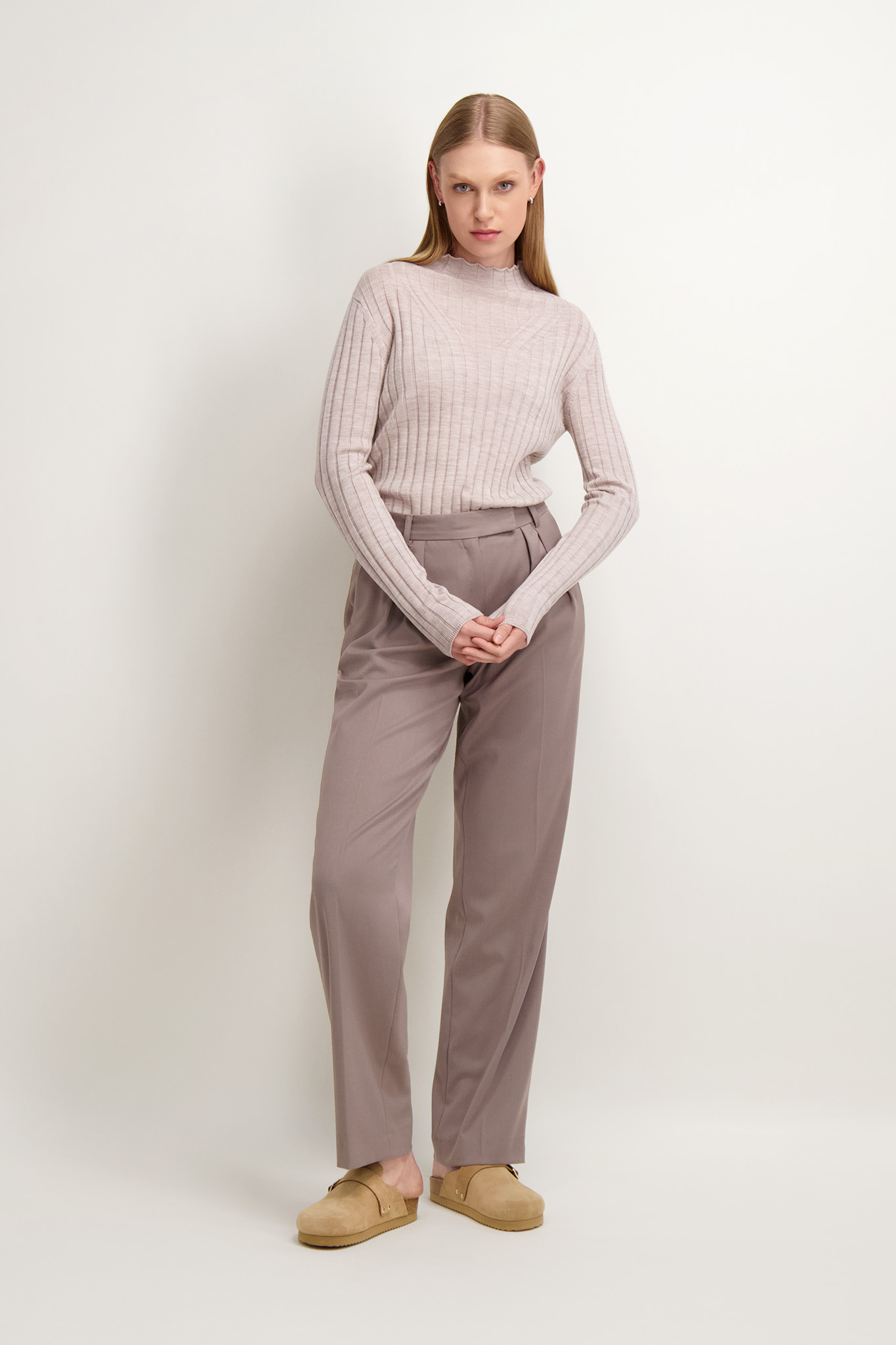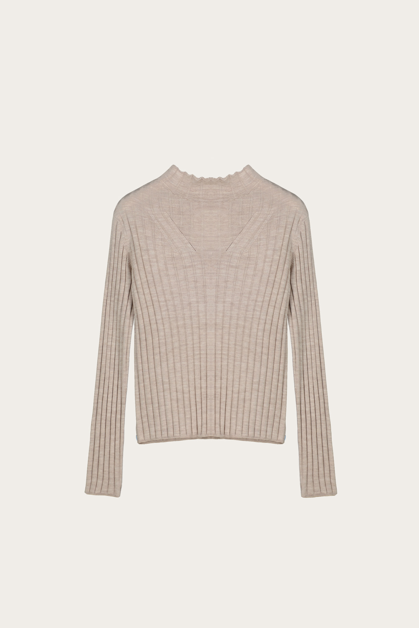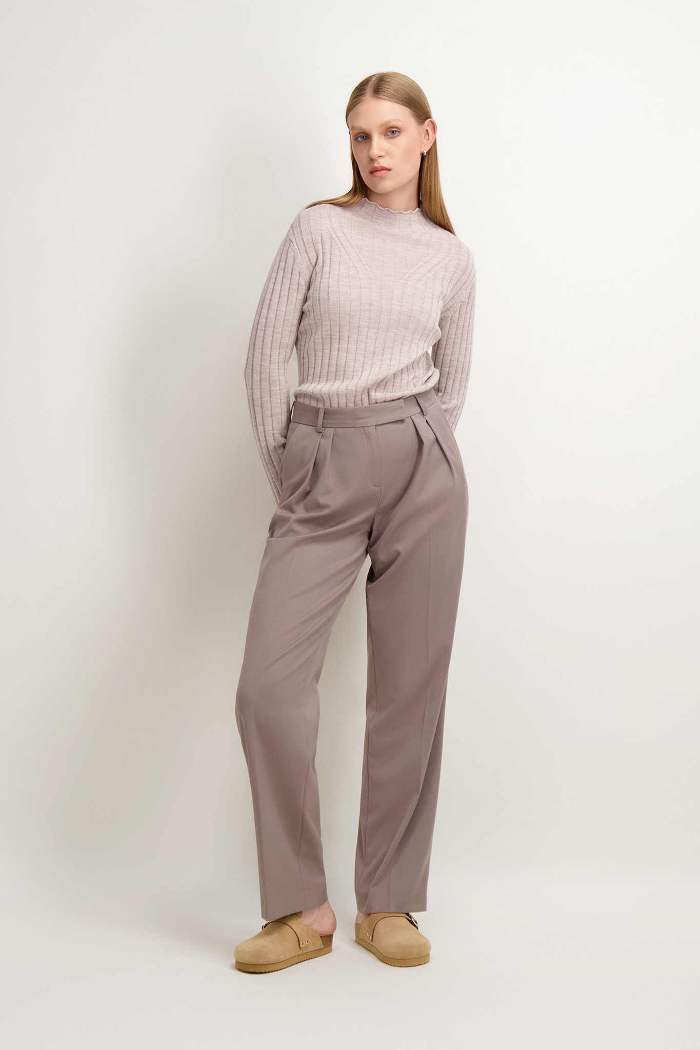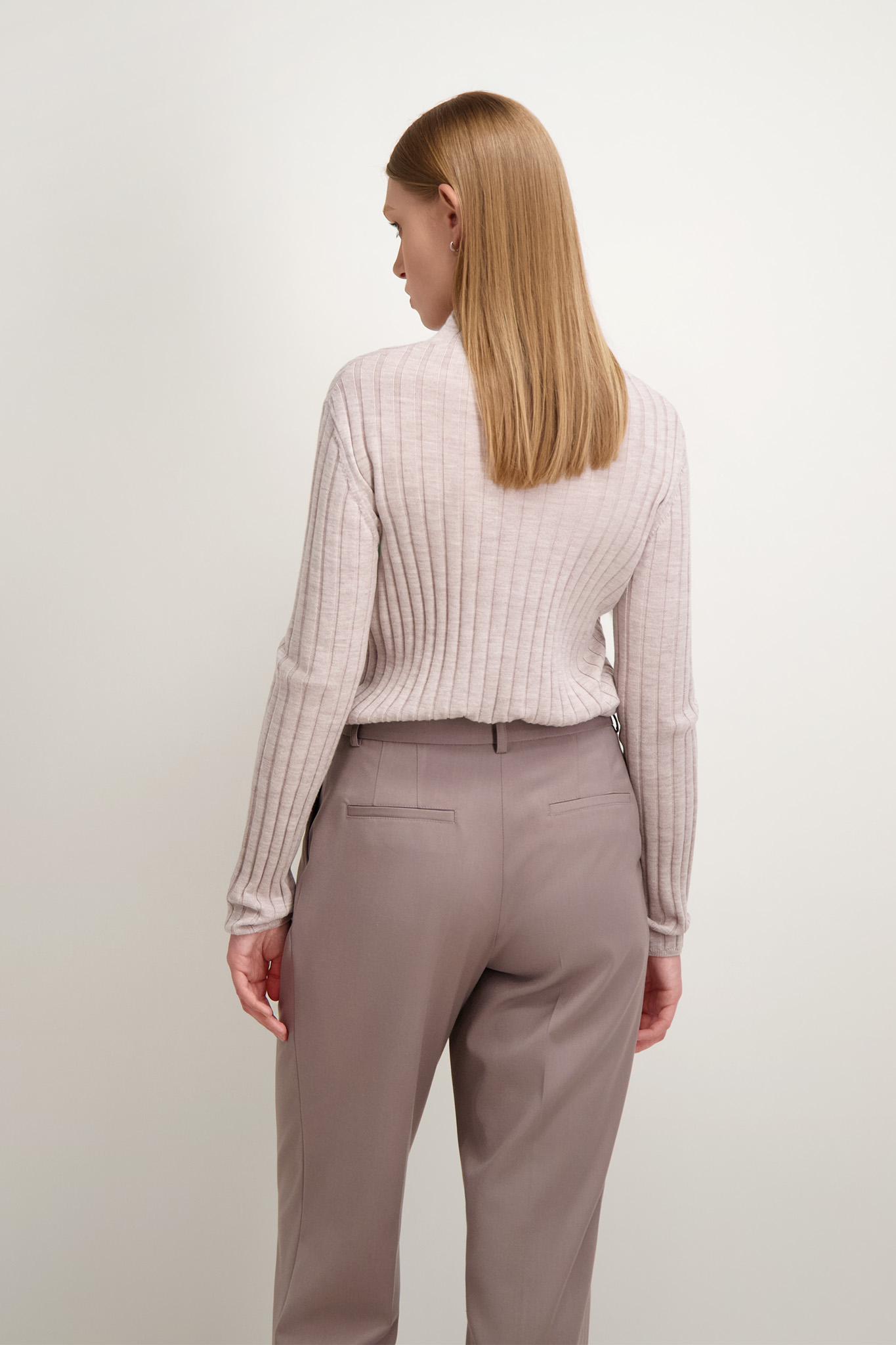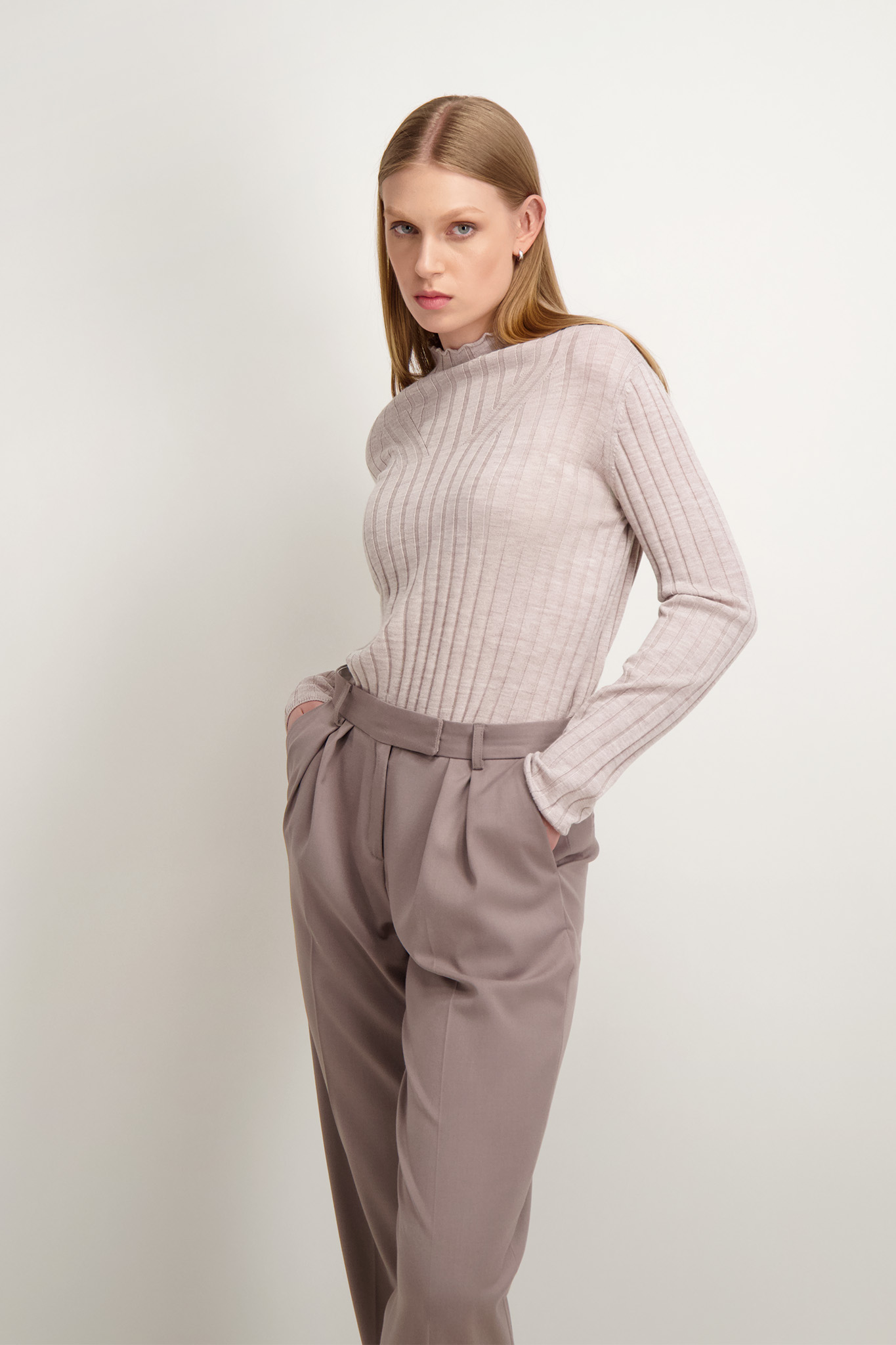 Półgolf w szeroki prążek. Model o dopasowanym fasonie. Wykonany z dzianiny merino wool extra fine. To lekka, miękka przędza, uszlachetniona dodatkowym procesem, który daje efekt soft.