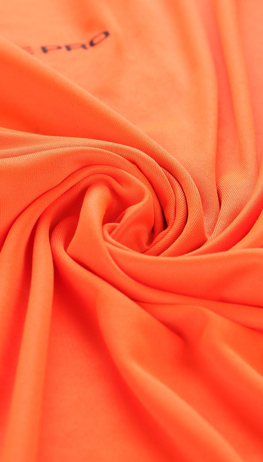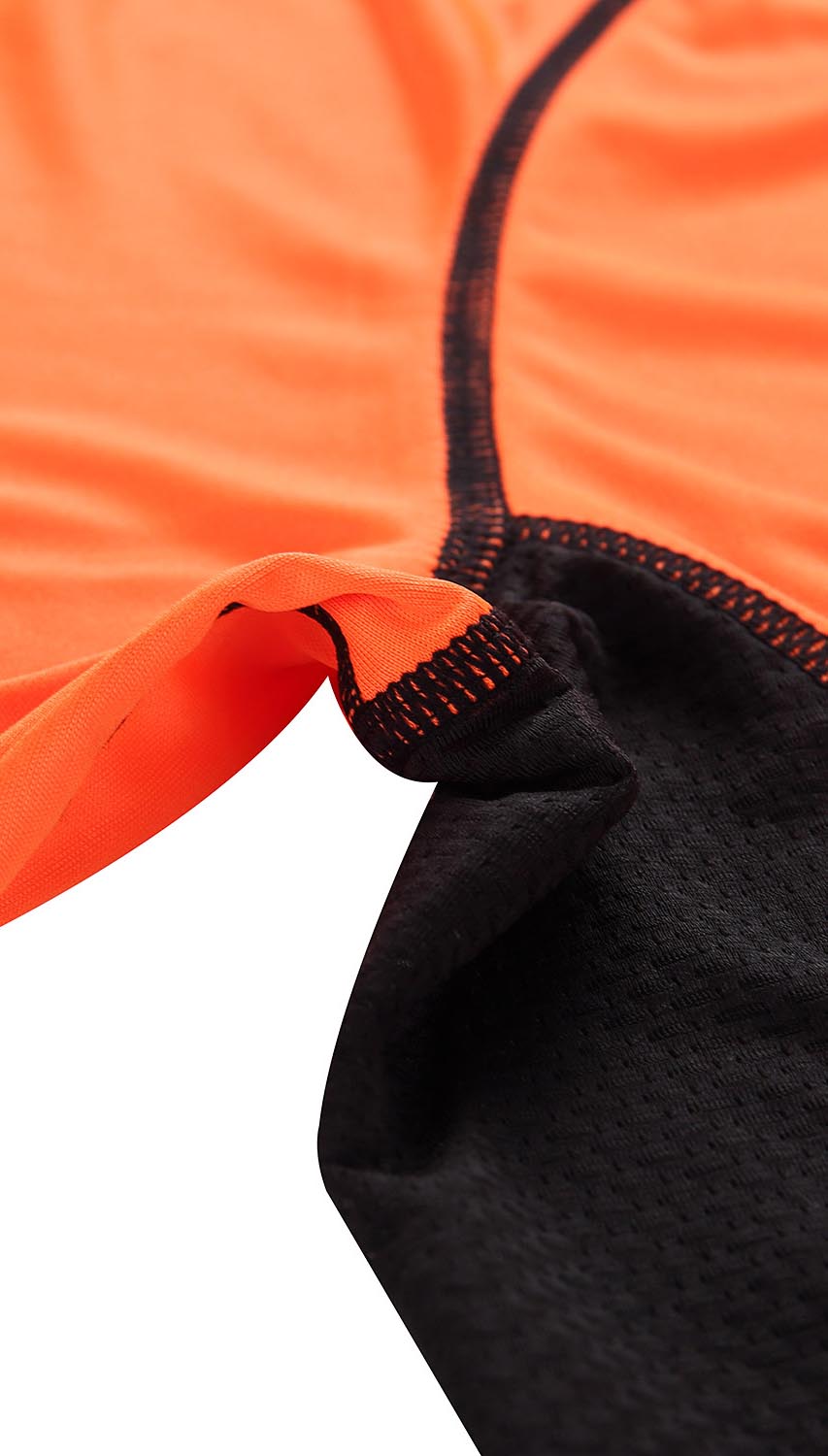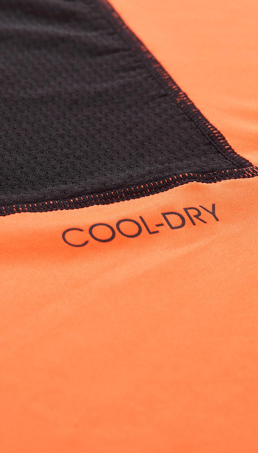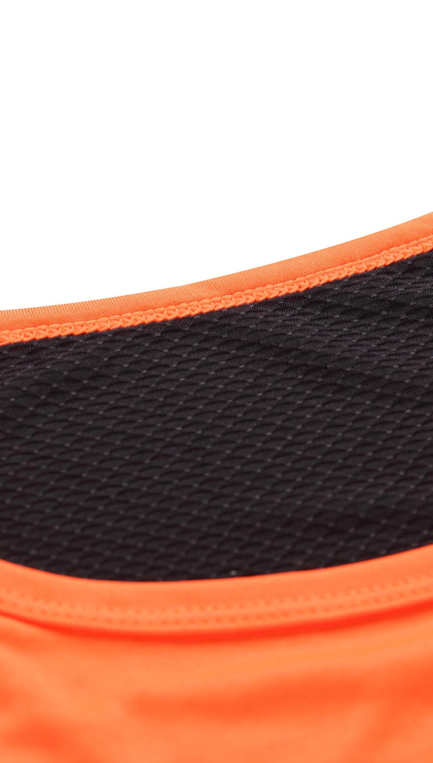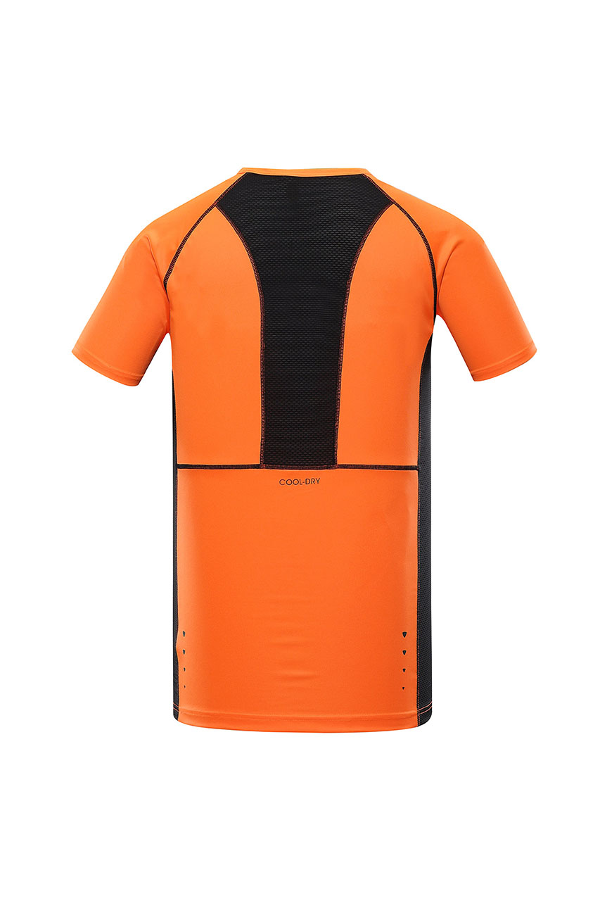 Treningowa koszulka męska w odcieniu pomarańczowym. Posiada krótki rękaw, okrągły kołnierzyk oraz elementy odblaskowe i czarne przeszycia. Koszulka została uszyta z tkaniny, która znakomicie odprowadza pot oraz szybko wysycha, a plecy są wykonane z czarnej siateczki. Z uwagi na to, jest świetną propozycją na trening lub jako pierwsza warstwa w ubiorze na trekking. Koszulka posiada regularny fason, który pozwala na swobodne ruchy. Dzięki kontrastowemu kolorowi koszulka pozostaje widoczna nawet w trudnych warunkach atmosferycznych oraz pozwala wyróżnić się, nawet podczas treningu.