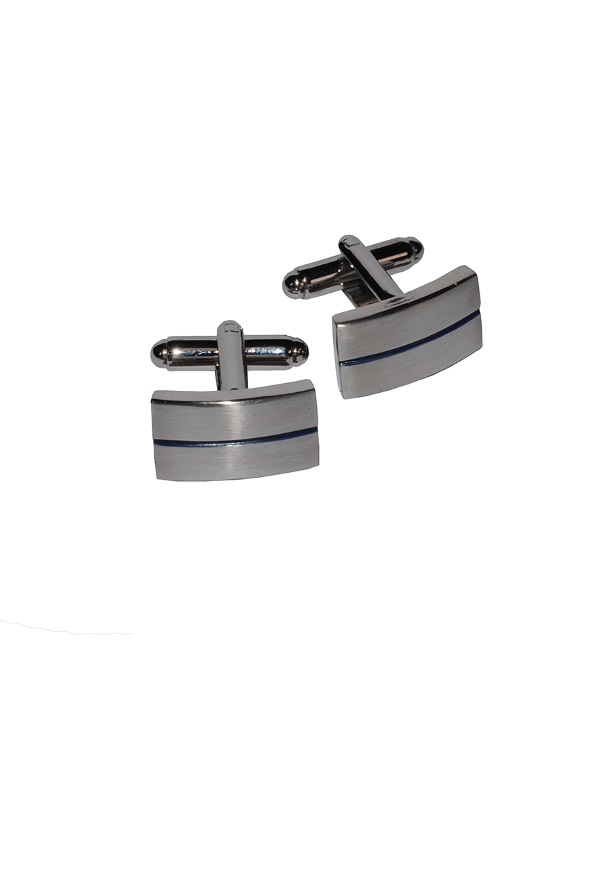 Srebrne prostokątne spinki do mankietów z jedną pojedynczą poziomą linią w granatowym odcieniu. To model, który idealnie doda szyku białej koszuli. Prostokątne spinki na srebrnej stopce to ponadczasowy, uniwersalny wzór do eleganckich zestawień.