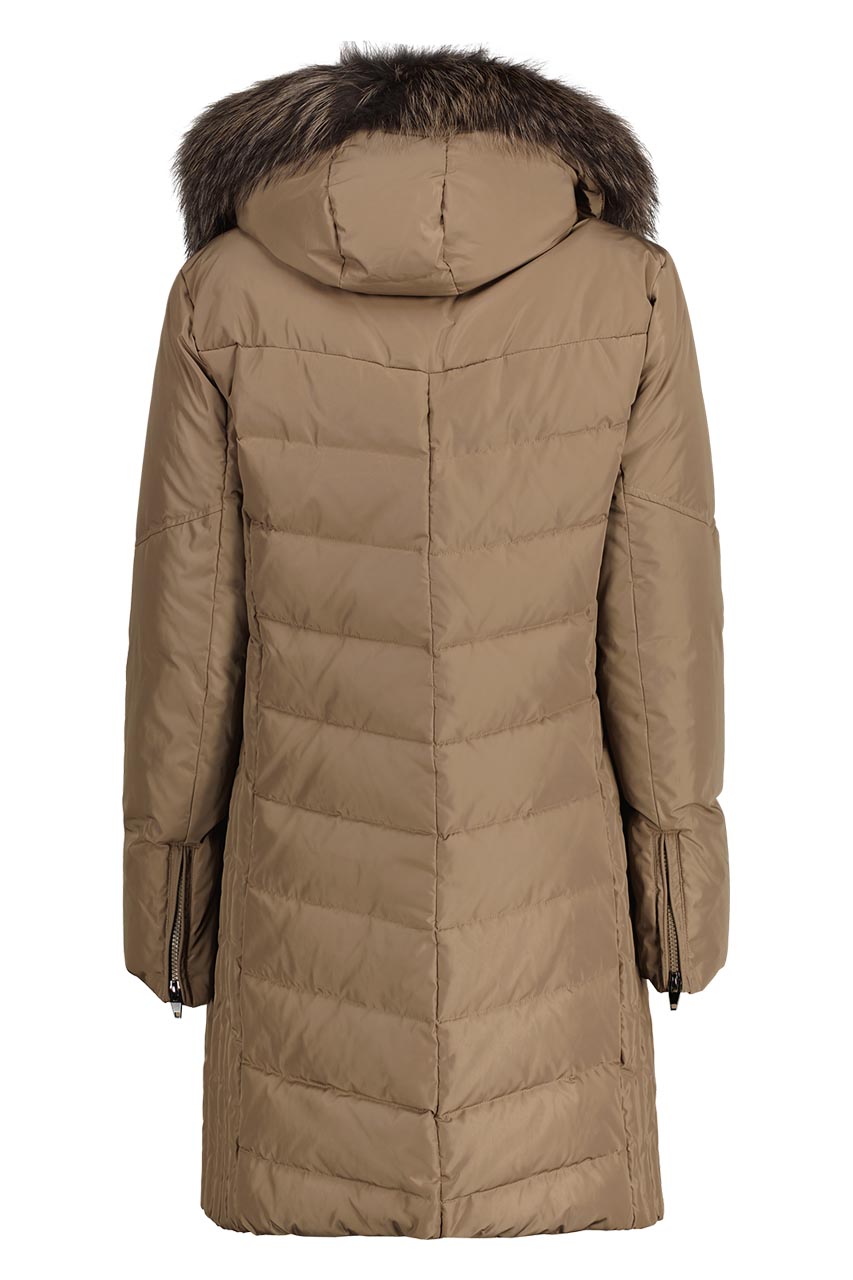 Model z wypełnieniem 70% puchu naturalnego. Kurtka pikowana, posiada dwie kieszenie skośne zapinane na zamek oraz odpinany kaptur z naturalnym futrem, które również można odpiąć. Model o dłuższym kroju, zapinany na zamek i napy.