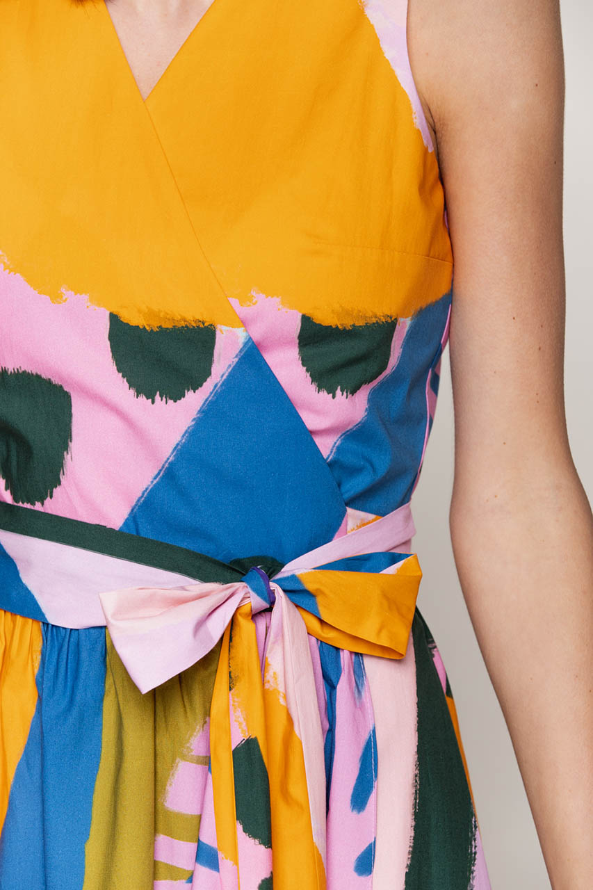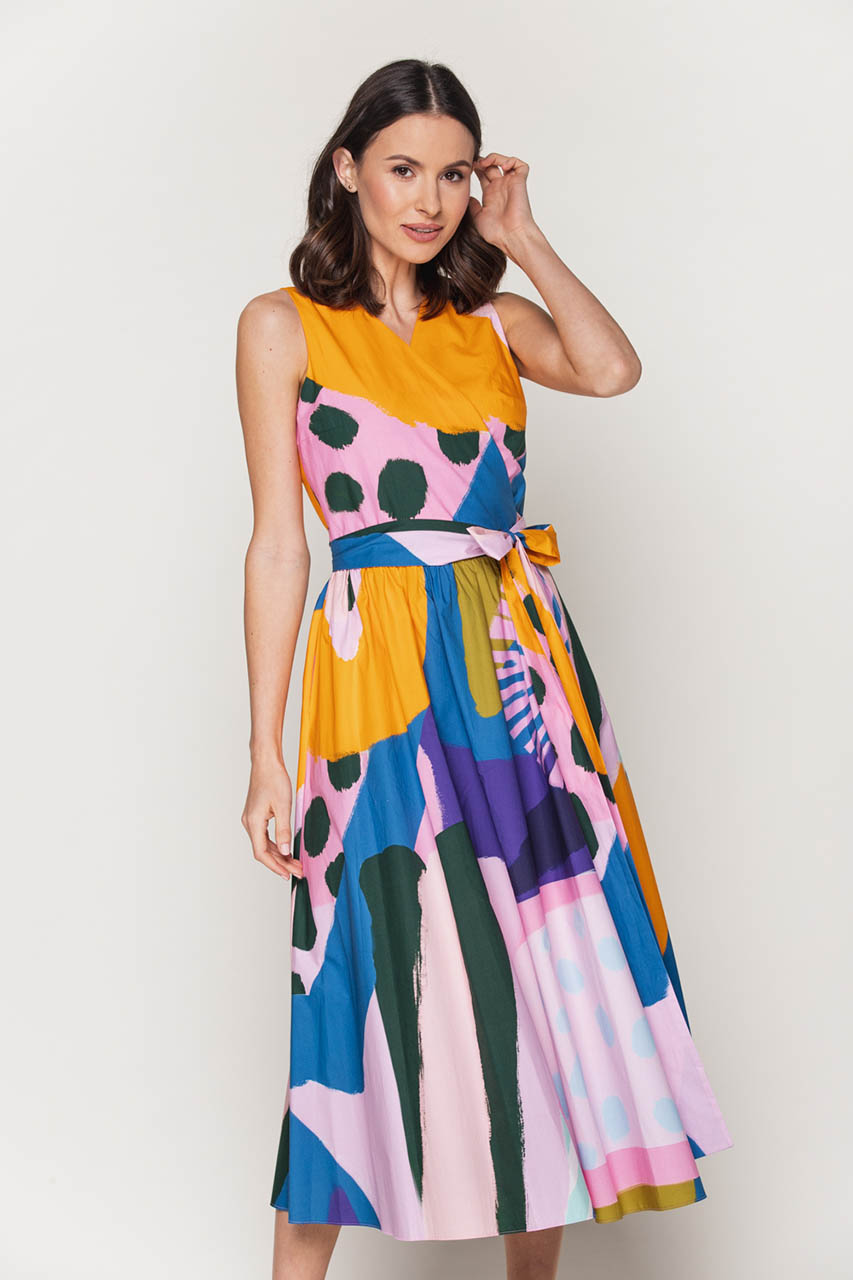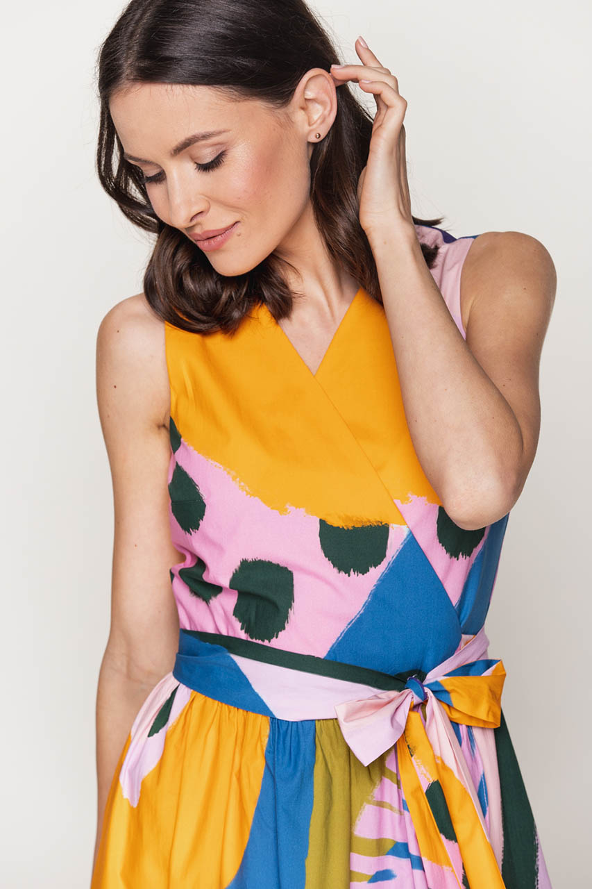 Sukienka jest propozycją dla kobiet, które chcą ożywić swoją garderobę. Model na podszewce, uszyty z bawełnianej tkaniny. Sukienka o kopertowym kroju to fason, który doskonale układa się na każdego typu sylwetce. Model z szarfą, która dodatkowo pięknie podkreśla talię. Sukienka świetnie odnajdzie się podczas mniej formalnych spotkań lub podczas uroczystości rodzinnych.