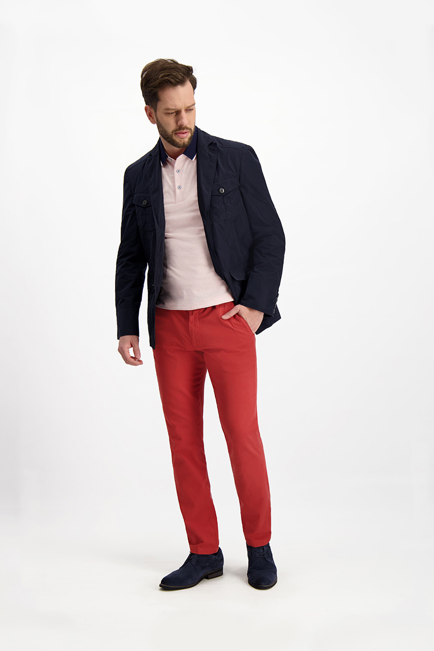 Koszulka męska typu polo w odcieniu bladego różu, która posiada kołnierzyk, krótki rękaw oraz zapięcie na kontrastowe guziczki. To klasyczna koszulka polo, która została uszyta z miękkiej tkaniny bawełnianej w mikro wzór. Jest typowo wiosenną propozycją, która doskonale sprawdzi się w zestawie casualowym z jeansami, czy w weekendowym wydaniu z białymi szortami i mokasynami. To także ciekawe urozmaicenie męskiej garderoby, w której nierzadko dominuje biel, czerń oraz szarość.
