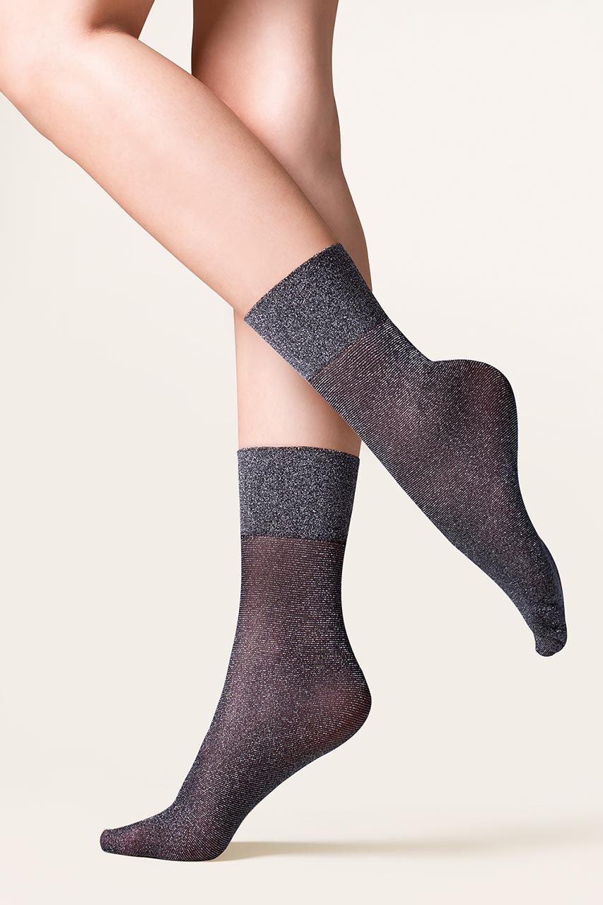 Skarpetki damskie w odcieniu czerni z połyskującą nicią. Model o ekskluzywnym zdobieniu, który sprawdzi się rewelacyjnie z eleganckimi spodniami oraz półbutami. To także ciekawa propozycja dla pań, które lubią się wyróżniać i nieobce są im stylizacje z ozdobnymi skarpetkami oraz spódnicami midi. Dzięki bezuciskowym ściągaczom oraz niewidocznemu wzmocnieniu przy palcach skarpetki są wyjątkowo komfortowe, a na dodatek w oryginalny sposób wzbogacają eleganckie stylizacje.