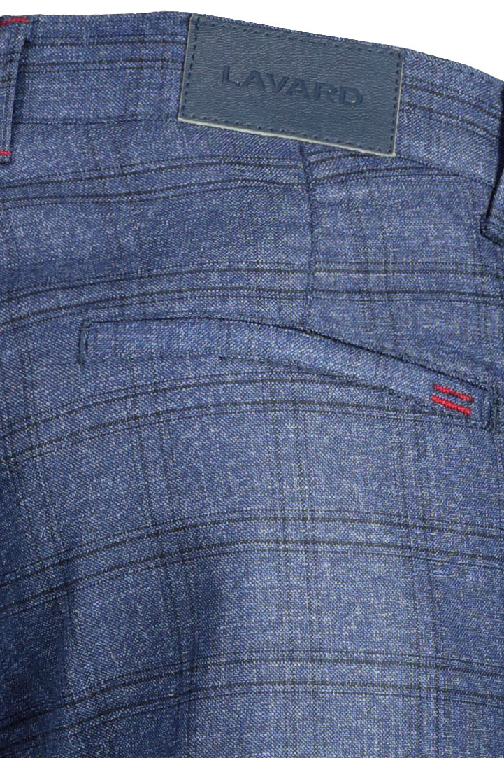 Granatowe spodnie męskie w kratę chinos. Model o regularnym kroju wykonany z przyjemnej w dotyku tkaniny. Spodnie z subtelnym czerwonym akcentem w postaci przeszyć guzika i przeszyć szlufek . Posiadają dwie kieszenie skośne oraz dwie tylne jednowypustkowe. Model zapinany na zamek i guzik. Stanowi świetną propozycję do miejskich stylizacji. Pięknie wygląda w towarzystwie niebieskiej lub szarej marynarki.