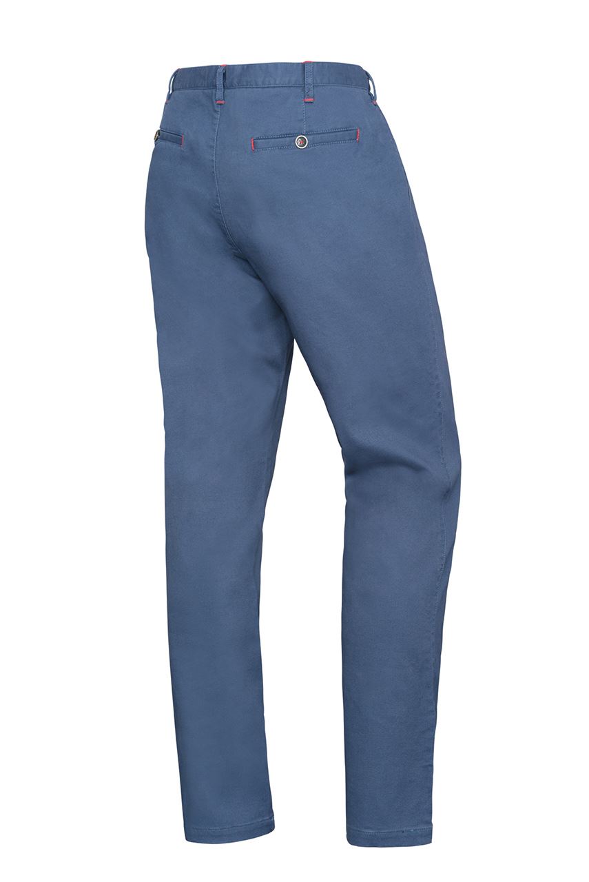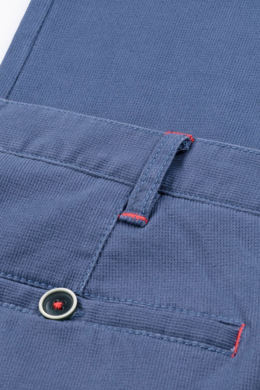 Niebieskie spodnie, wykonane z bawełnianej tkaniny z delikatną strukturą. Model posiada pięć kieszeni: dwie skośne z przodu, dwie wpuszczane z tyłu, zapinane na guzik oraz biletówkę. Wnętrze spodni wzmocnione gurtem we wzór paisley. Spodnie o klasycznym, regularnym kroju i z prostymi nogawkami. Model zapinany na guzik i zamek. Spodnie posiadają kontrastowe akcenty w postaci czerwonych nici przy szlufkach, guzikach i kieszeniach. Dodatek elastycznego włókna korzystnie wpłynie na komfort użytkowania. Spodnie sprawdzą się w codziennych stylizacjach.