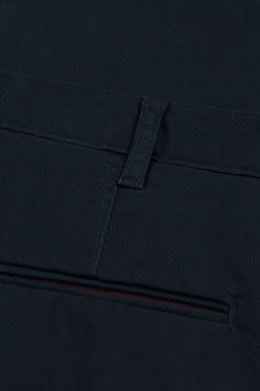 Spodnie typu chino utrzymane w ponadczasowej barwie ciemnego granatu. Uniwersalny model w casualowym stylu o kroju slim z pięcioma kieszeniami. Z przodu dwie kieszenie typu chino wykończone materiałem w kontrastowym, bordowym kolorze i zegarówka. Z tyłu dwie kieszenie dwuwypustkowe. Wykonane z wysokiej jakości bawełny, domieszka włókien syntetycznych zwiększa komfort użytkowania. Spodnie zapinane na zamek i guzik. Doskonale sprawdzą się w półformalnych zestawach z błękitną koszulą oraz w luźnych miejskich stylizacjach z ciepłym swetrem.
