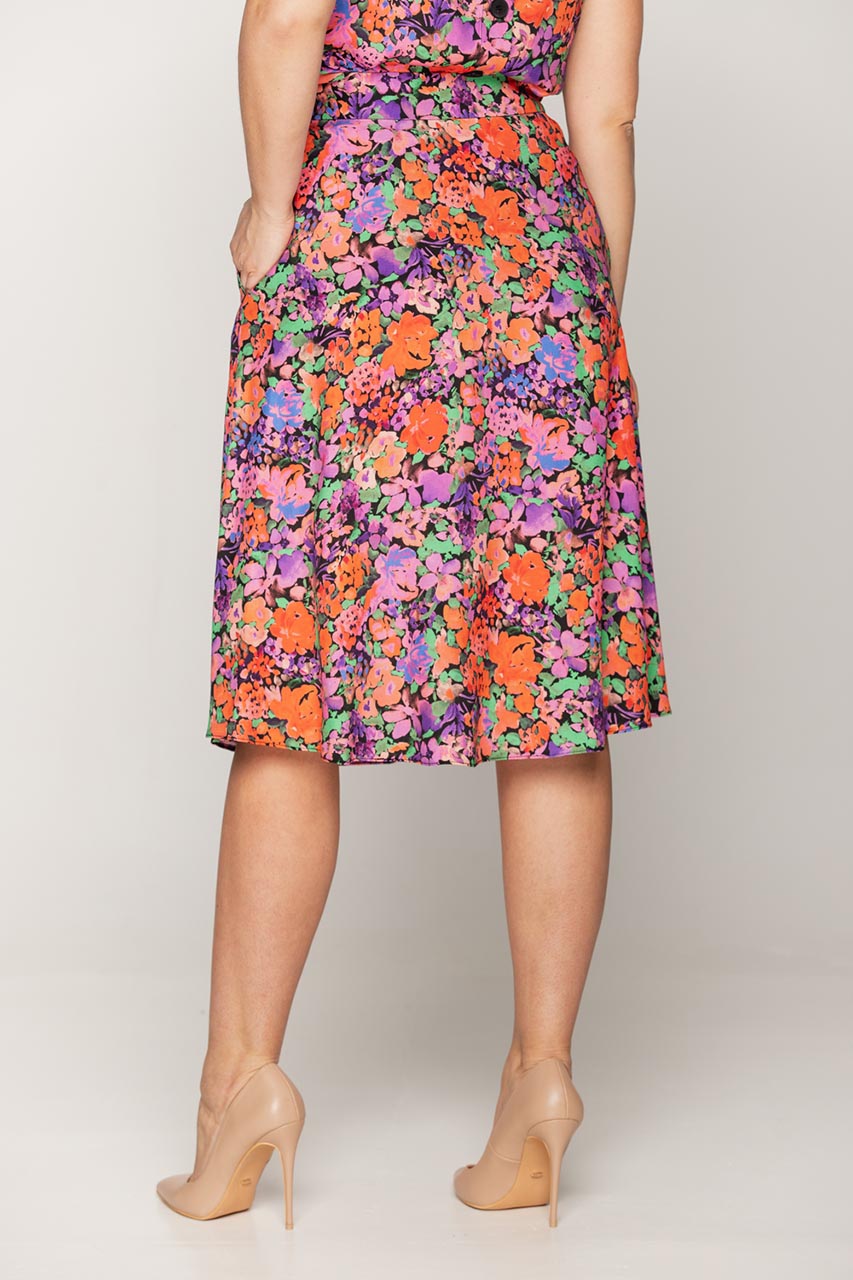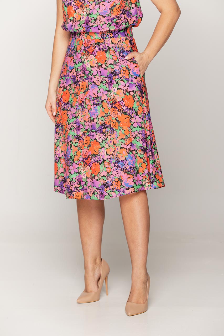 To model stworzony do letnich stylizacji. Spódnica w kwiaty doda lekkości i świeżości każdemu outfitowi. Model uszyty w 100% z wiskozy, dzięki temu doskonale sprawdza się nawet w gorące dni. Spódnica za kolano, o trapezowym kroju, świetnie prezentuje się na każego typu sylwetce. Propozycja zapinana z boku na kryty zamek. Dodatkowo posiada dwie kieszenie ukryte w bocznych szwach.