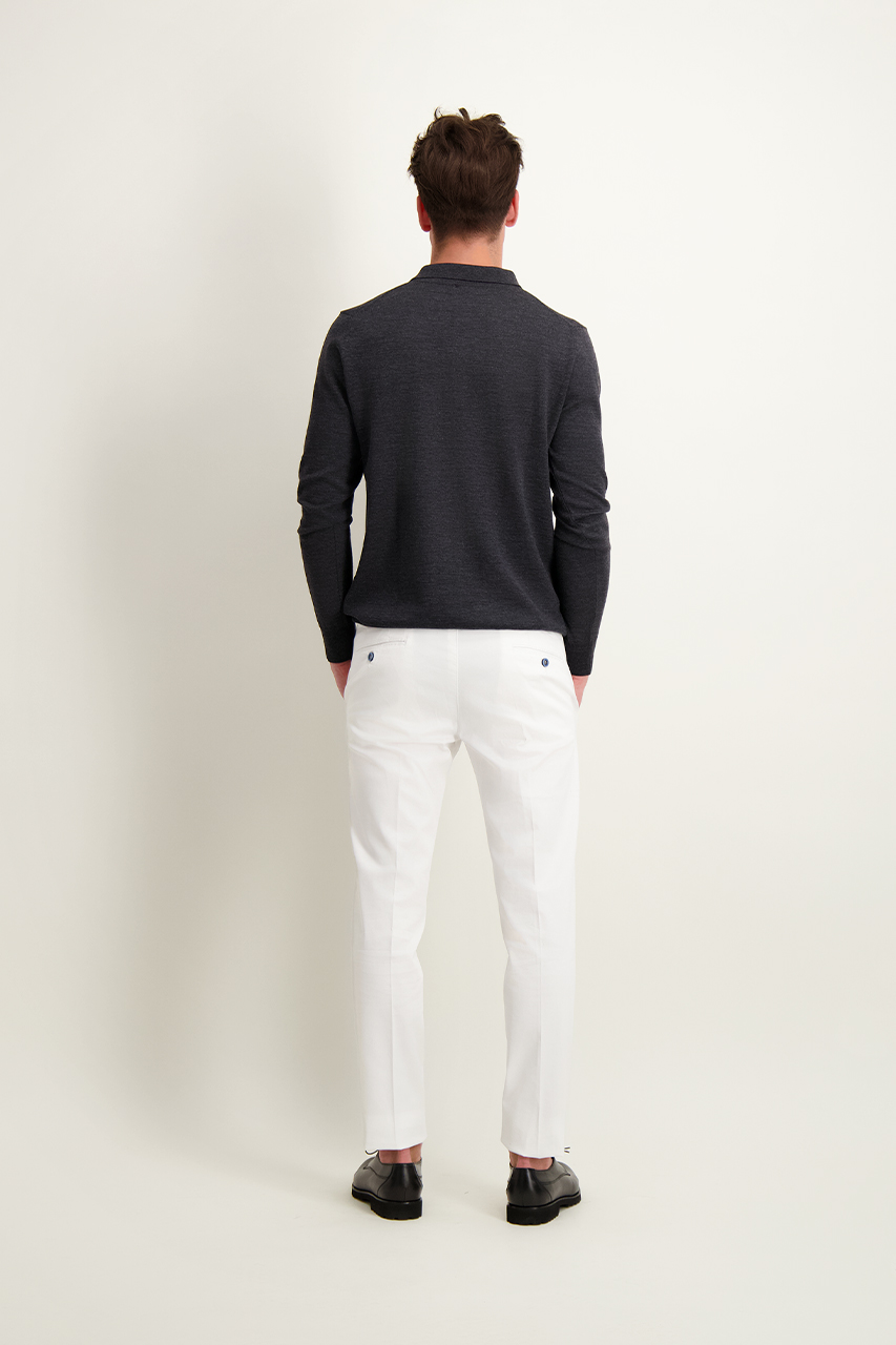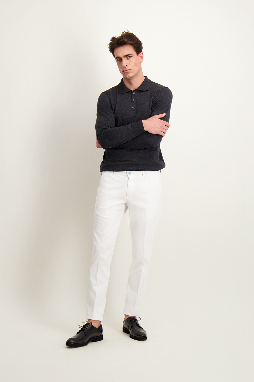 Spodnie typu chinos w białym kolorze. Model o klasycznym fasonie, uszyty z elastycznej tkaniny bawełnianej w strukturalny prążek. Model ma 188 cm wzrostu i prezentuje rozmiar 50.