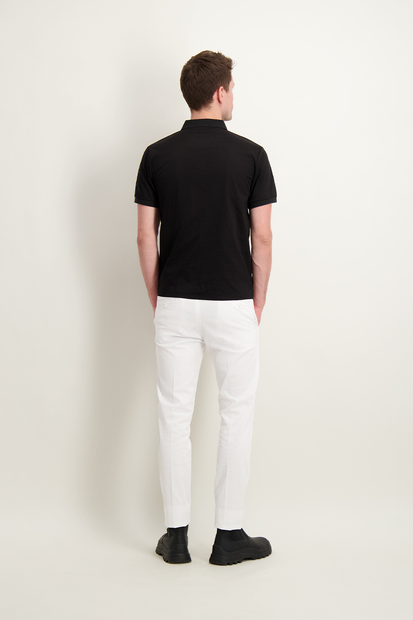 Spodnie typu chinos w białym kolorze. Model o klasycznym fasonie, uszyty z elastycznej tkaniny bawełnianej w strukturalny prążek. Model ma 188 cm wzrostu i prezentuje rozmiar 50. Wyprodukowano w Polsce.