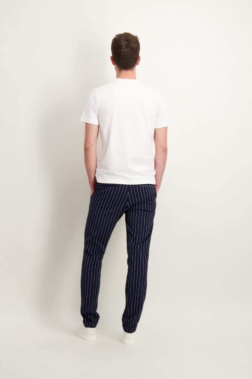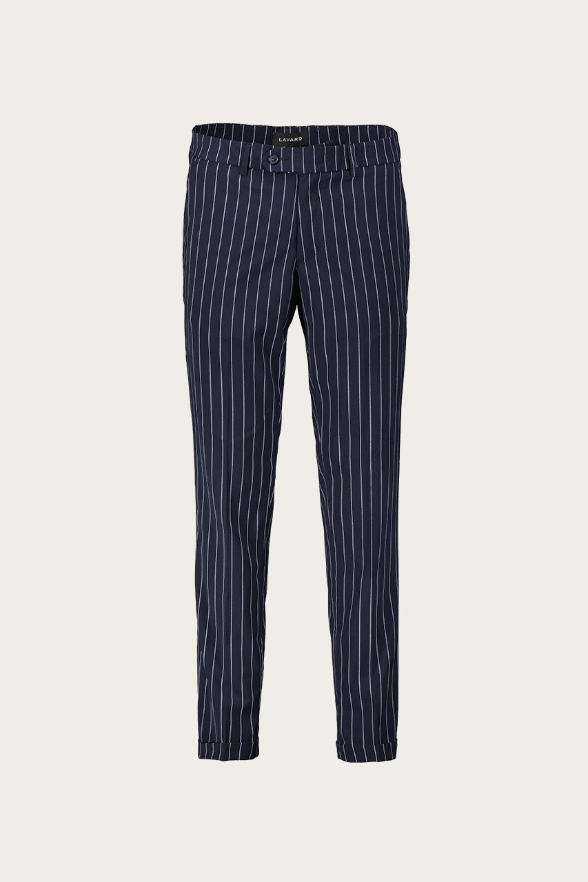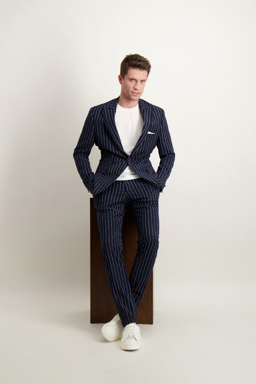 Granatowe spodnie w białe prążki. Model o klasycznym fasonie. Z marynarką (46195) z tej samej tkaniny tworzą garnitur. Model ma 188 cm wzrostu i prezentuje rozmiar 50.