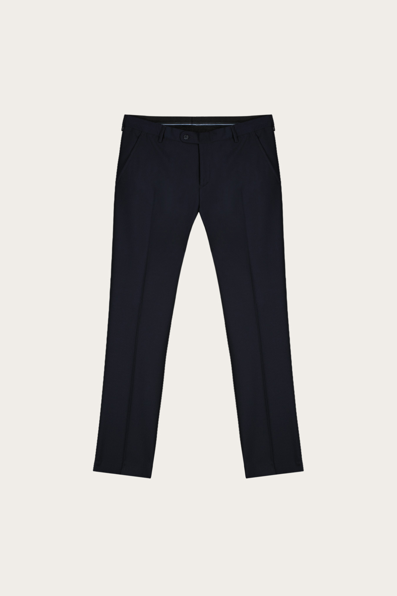 Spodnie o dopasowanym fasonie. Z marynarką z tej samej tkaniny tworzą garnitur. Model ma 185 cm wzrostu. Prezentuje rozmiar 50.