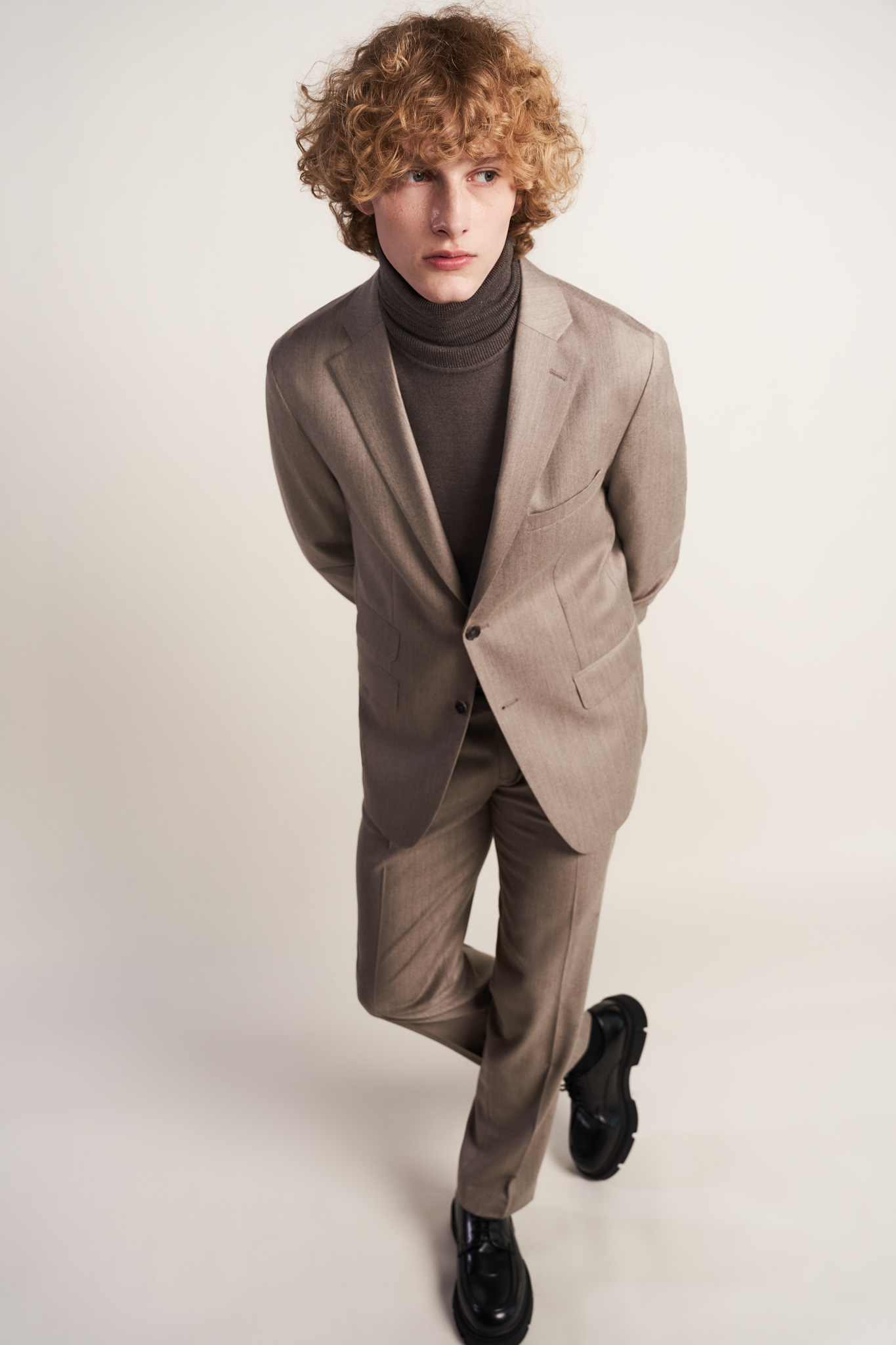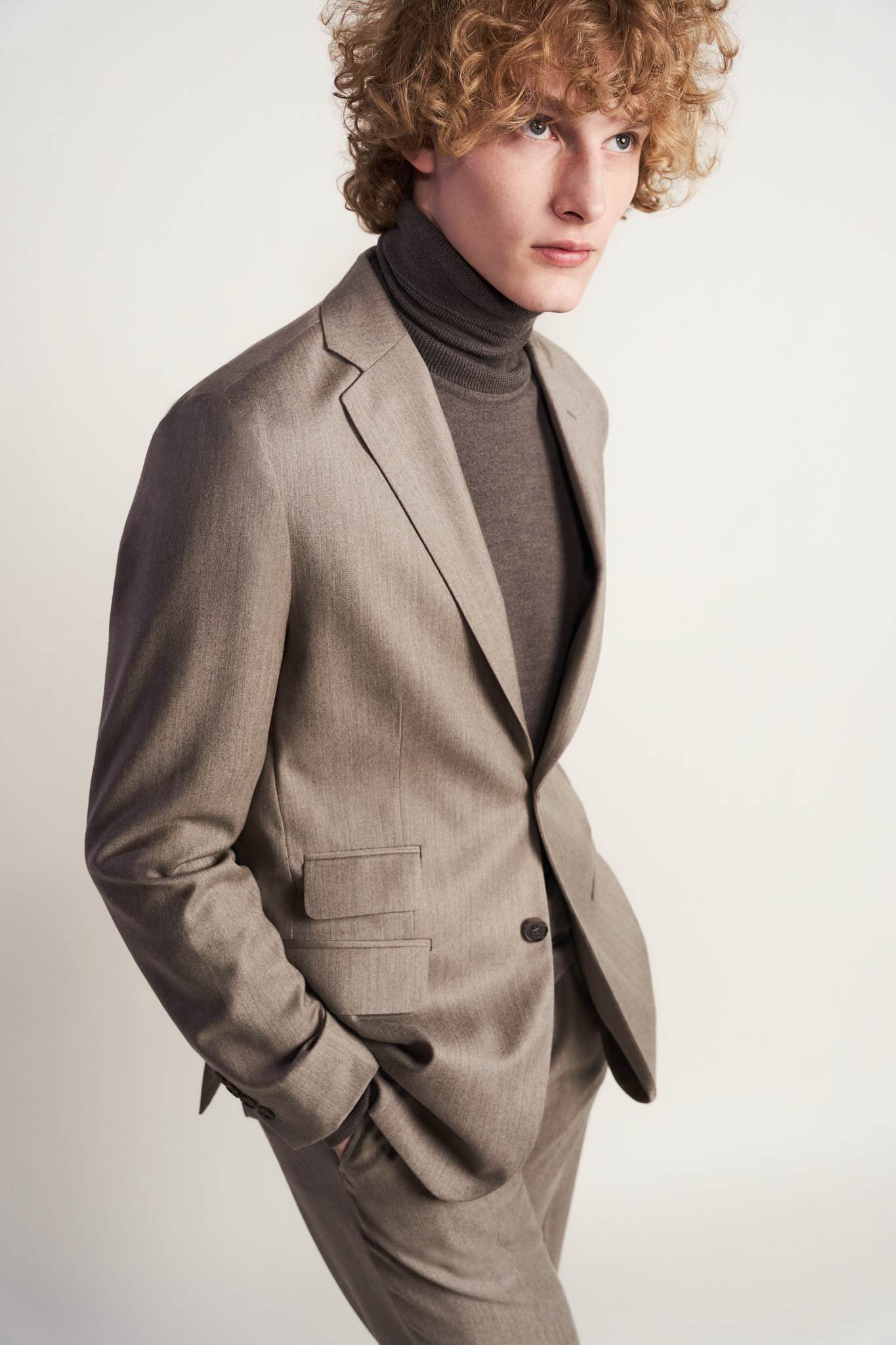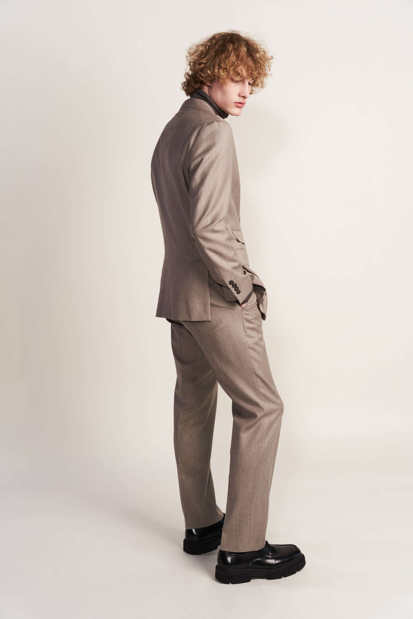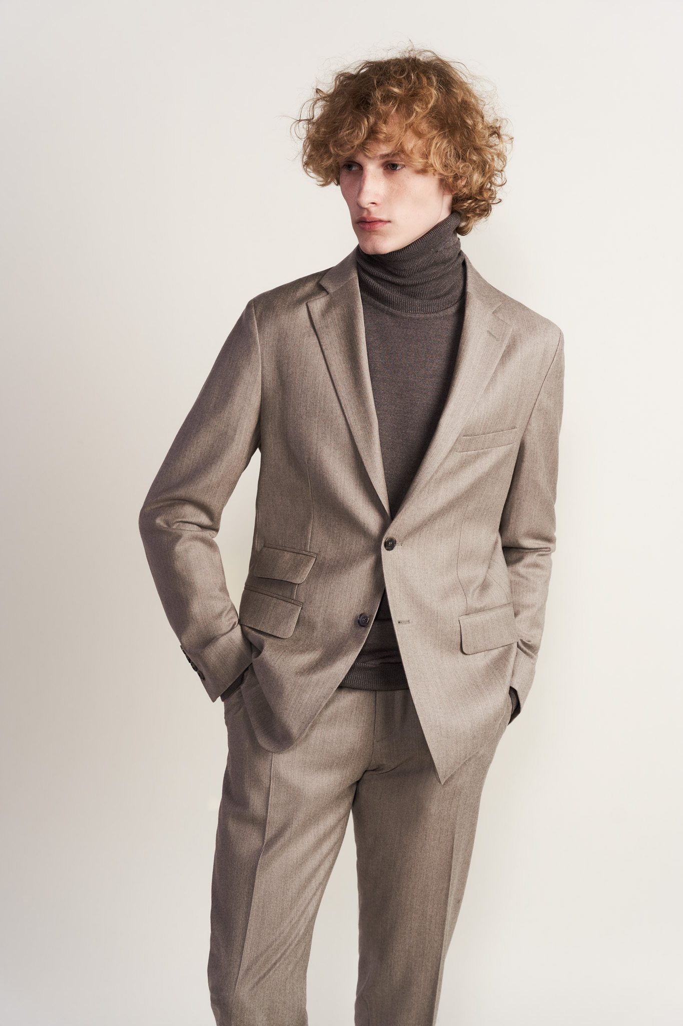 Spodnie z miękkiej beżowej flaneli z kaszmirem Nogawka spodni 19 cm . Spodnie uszyte z tkaniny pochodzącej z włoskiej tkalni Zignone. Z marynarką (45433) z tej samej tkaniny tworzą garnitur. Można też łączyć z overshirtem z tej samej tkaniny (29966)
