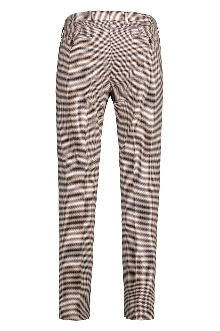 Spodnie męskie w pepitkę, utrzymane w beżowej, czarnej i brązowej kolorystyce. Spodnie fantastycznie prezentują się z zamszowymi sztybletami i beżowym golfem. Z kolei dla fanów total look'u proponujemy kamizelkę i marynarkę z tej samej tkaniny.