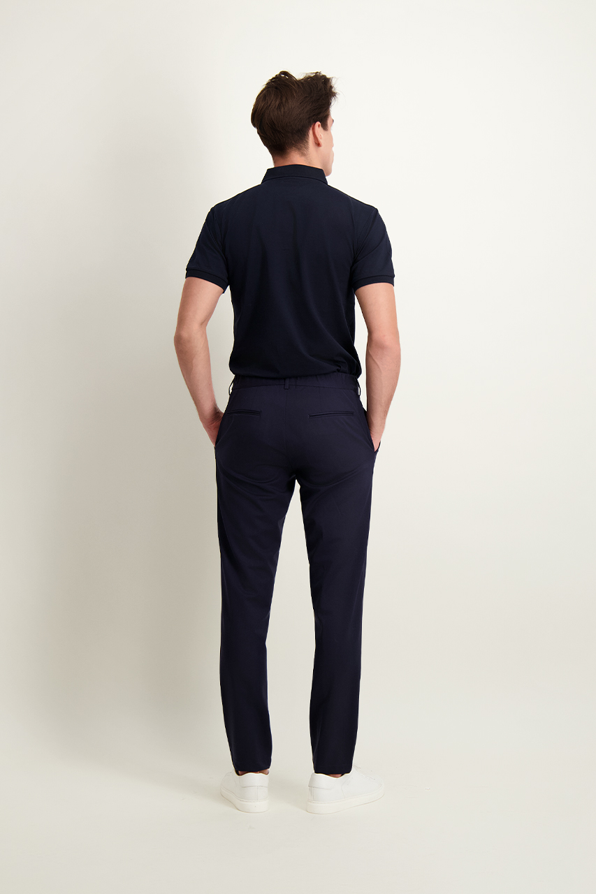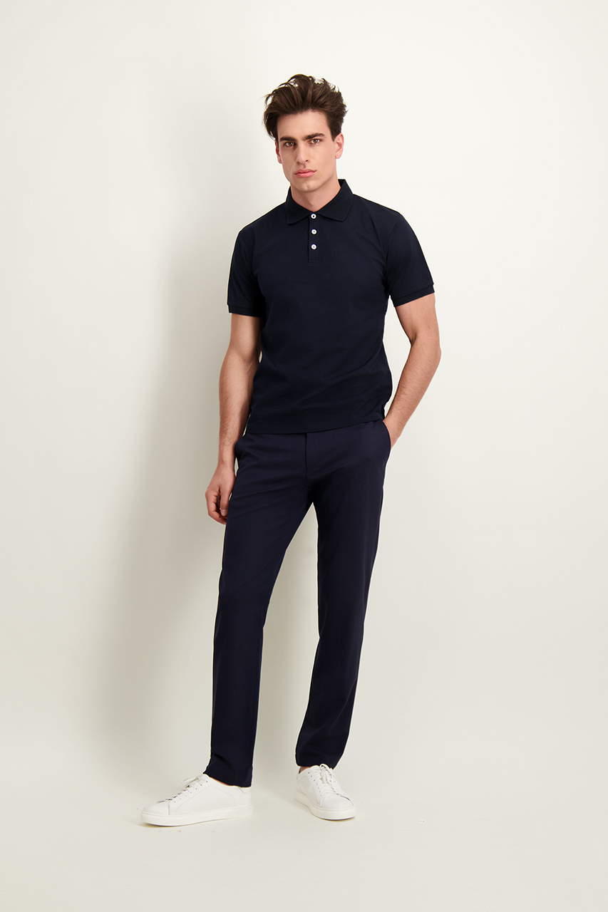Granatowe spodnie z prostymi nogawkami. Uszyte z elastycznej, wełnianej tkaniny najwyższej jakości. Z marynarką (45384) z tej samej tkaniny tworzy garnitur. Model ma 187 cm wzrostu i prezentuje rozmiar 48. Wyprodukowano w Polsce.
