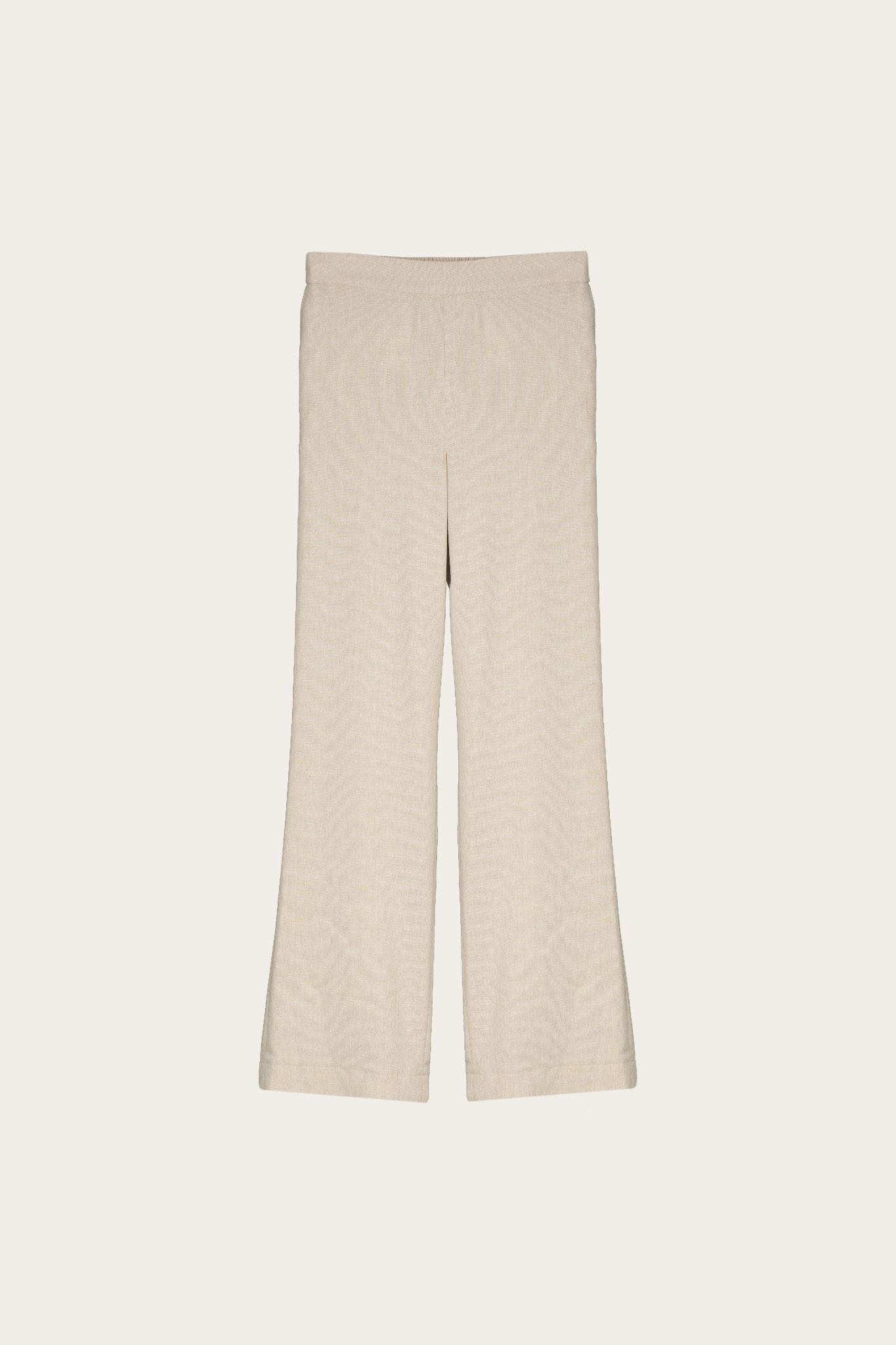 Beżowe spodnie z luźnymi, szerokimi nagawkami. Wygodny model uszyty z miękkiej tkaniny z dodatkiem lnu. Posiada z przodu gładki pasek a z tyłu wszytą gumę. Spodnie z marynarką (86450) z tej samej tkaniny tworzą garnitur. Modelka ma 174 cm wzrostu i prezentuje rozmiar 36. Wyprodukowano w Polsce.