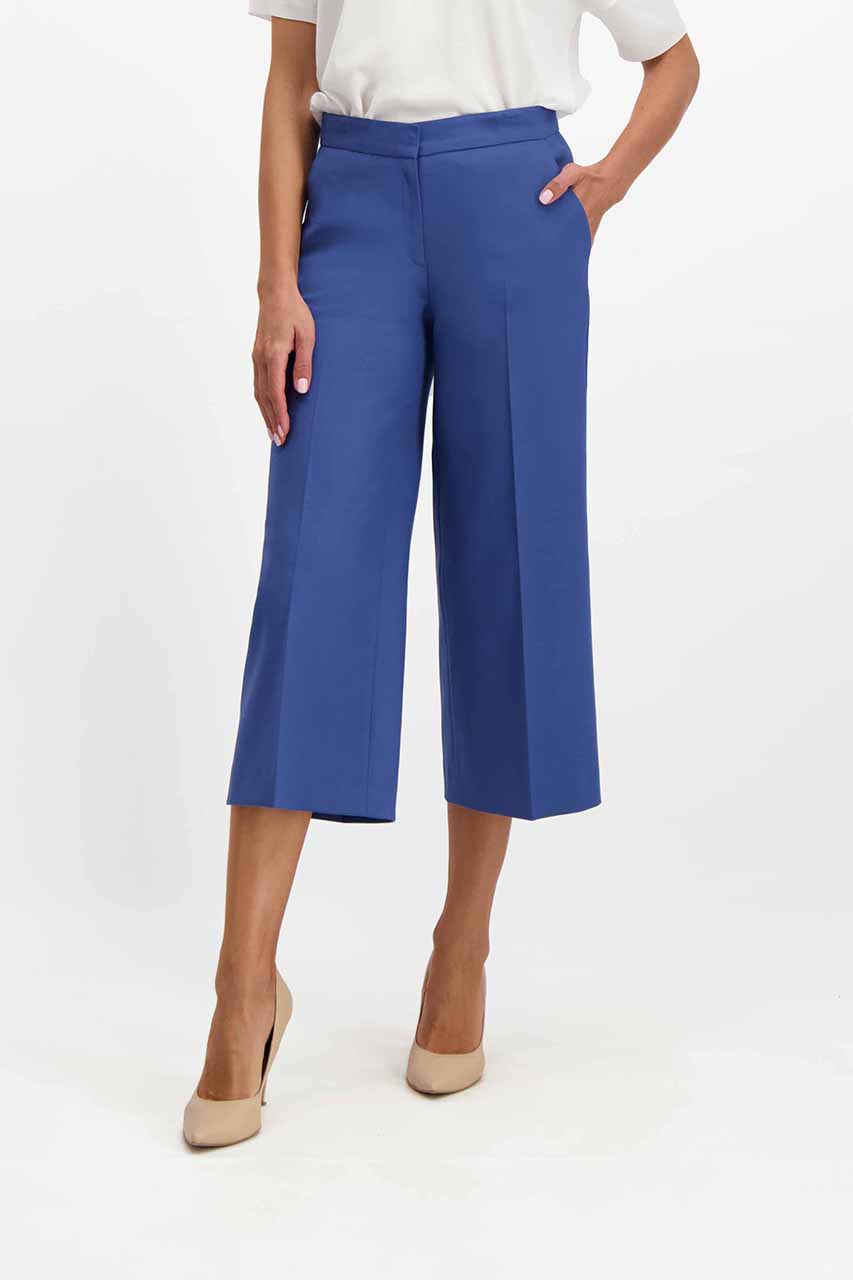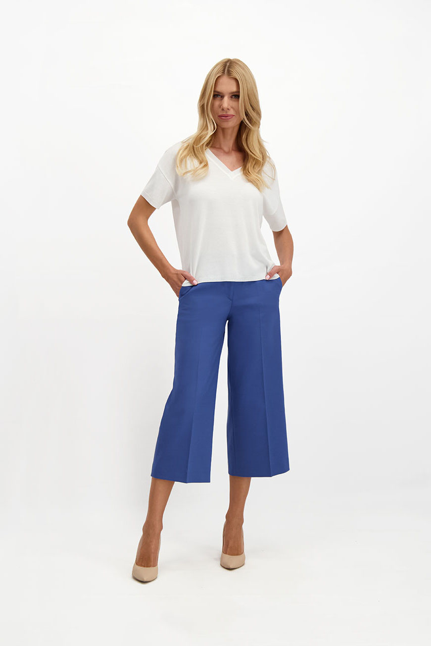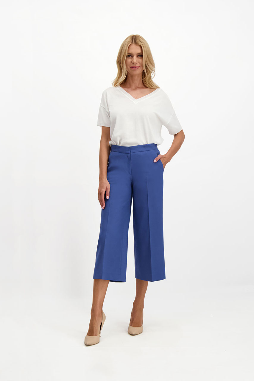 Spodnie z szeroka nogawką to niewątpliwie hit sezonu. Do tego w pięknym niebieskim kolorze i o modnej długości za kolano z pewnością wpadną w oko niejednej wielbicielce modowych wyzwań. Niebieskie coulotte damskie wykonane są z mięsistej tkaniny z dodatkiem bawełny. Zapinane na zamek i guzik, posiadają dwie kieszenie chino. Z marynarką z tej samej tkaniny tworzą oryginalny garnitur damski. Modelka ma 175 cm wzrostu. Prezentuje rozmiar 36.
