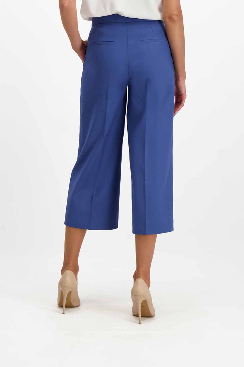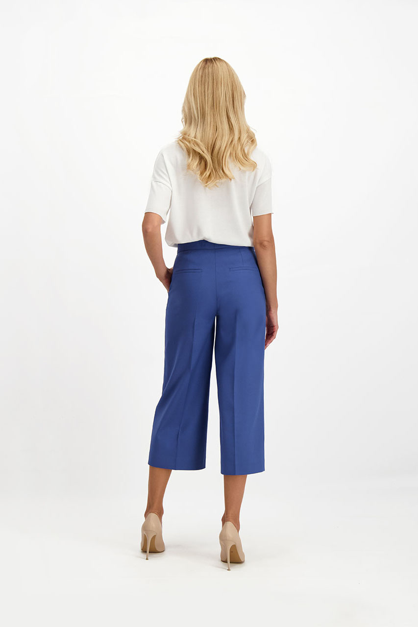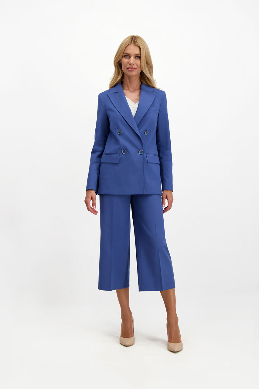 Spodnie z szeroka nogawką to niewątpliwie hit sezonu. Do tego w pięknym niebieskim kolorze i o modnej długości za kolano z pewnością wpadną w oko niejednej wielbicielce modowych wyzwań. Niebieskie coulotte damskie wykonane są z mięsistej tkaniny z dodatkiem bawełny. Zapinane na zamek i guzik, posiadają dwie kieszenie chino. Z marynarką z tej samej tkaniny tworzą oryginalny garnitur damski. Modelka ma 175 cm wzrostu. Prezentuje rozmiar 36.