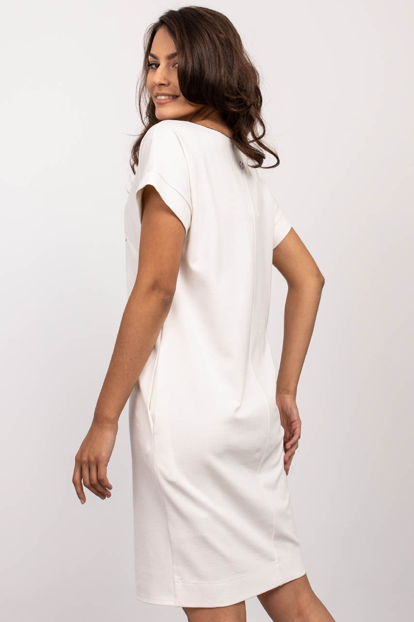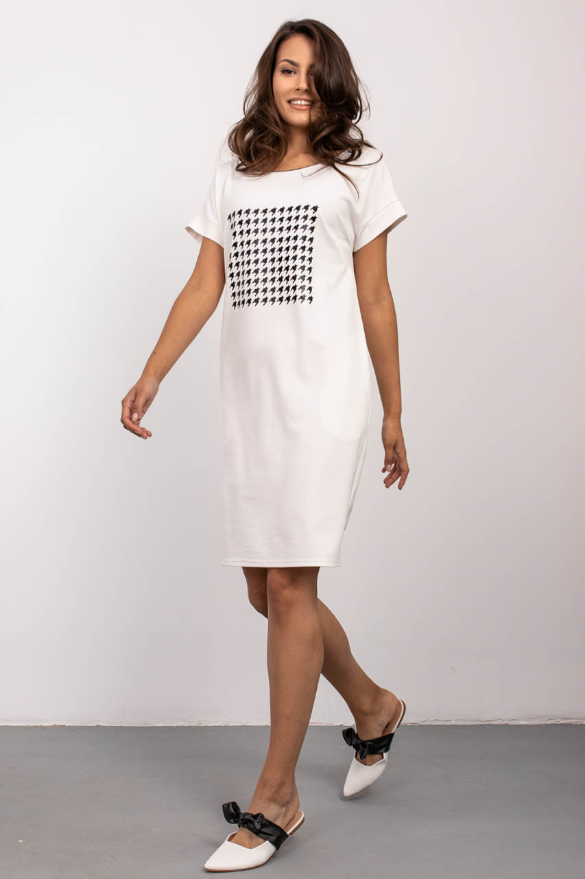 Casualowa sukienka z czarnym wzorem pepitki z przodu. Model o obniżonej lini ramion. Posiada okrągły dekolt, który świetnie podkreśli szyję i dekolt. Sukienka wykonana z miękkiej tkaniny o bardzo przyjemnym chwycie. To propozycja dla kobiet ceniacych wygodę i komfort w stylowym wydaniu.
