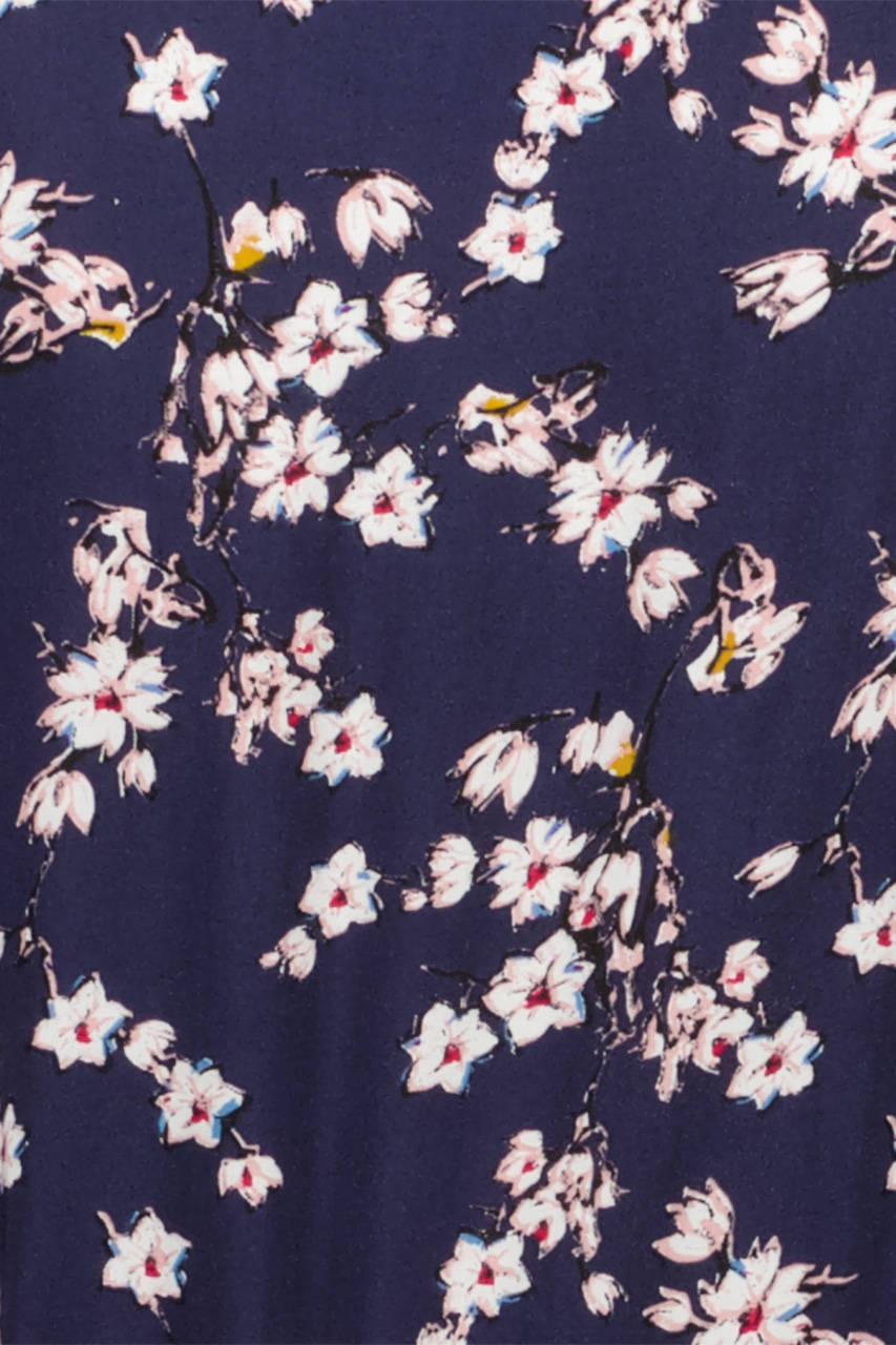 Granatowa sukienka z delikatnym kwiatowym wzorem, troczkiem w talii oraz falbaną. Krój szmizjerki zapinanej na guziczki łączy w sobie najbardziej kobiecy deseń, a także romantyczny detal czyli falbanę. Sukienka została wykonana w 100% z wiskozy, dlatego jest niezwykle zwiewna i delikatna oraz sprawdzi się znakomicie w wiosennych stylizacjach. Pas regulowany za pomocą troczka pozwala na dostosowanie kroju do własnej sylwetki oraz wyraźnego zaznaczenia talii. Kwiatowy wzór łączy w sobie odcienie écru oraz pudrowego różu. Oferowany model jest propozycją dla kobiet, które są fankami romantycznego stylu zarówno w modzie codziennej, a także wizytowej.